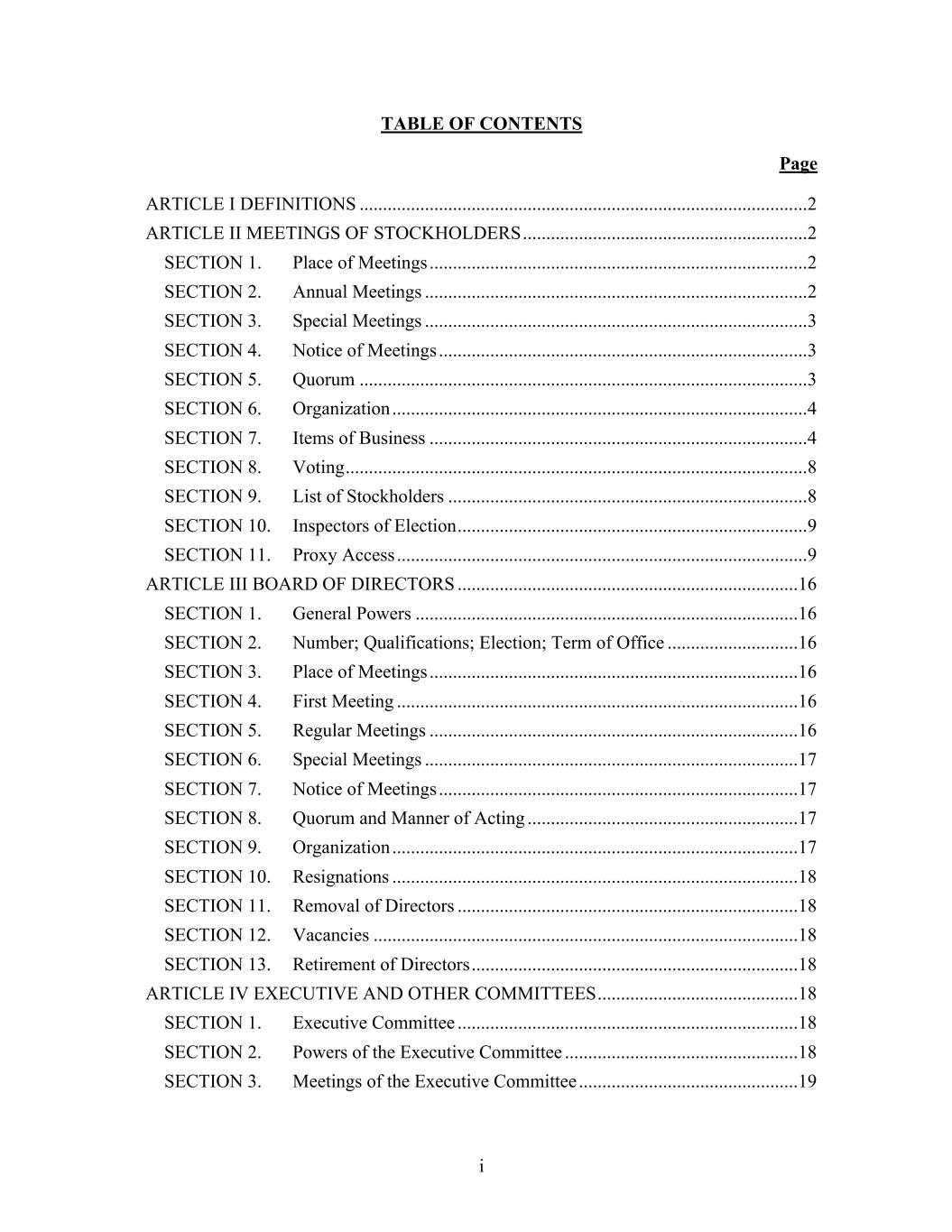 i目录页第一条第一项定义....................................................................................................2第二条股东大会....................................................2第一节。会议地点...................................................................................2第二节。年度会议....................................................................................2第三节。特别会议...................................................................................3第四节。会议通知.......................................................................3第五节。法定人数...................................................................................................3第6款。组织....................................................................................4第7节。经营项目....................................................................................4第八节。表决...................................................................................................8第9节。股东名单.....................................................................................8第十节。选举检查专员...................................................................................9第11节。代理访问................................................................................9条第三条董事会.....................................................................................16第一节。一般权力..................................................................................16第2节。人数;任职资格;选举;任期....................................16第三节。会议地点.......................................................................................16第四节。第一次会议...................................................................................16第五节。定期会议.................................................................................... 16第六节。特别会议................................................................................17第七节。会议通知.....................................................................................17第八节。法定人数和行事方式...................................................................17第9节。组织...................................................................................17第十节。辞职.................................................................................... 18第11节。罢免董事.................................................................................... 18第12条。空缺.................................................................................... 18第13款。董事退任....................................................................18第四条执行委员会和其他委员会.................................................... 18第一节。执行委员会.................................................................... 18第2节。执行委员会的权力.................................................... 18第3节。执行委员会的会议.................................................... 19