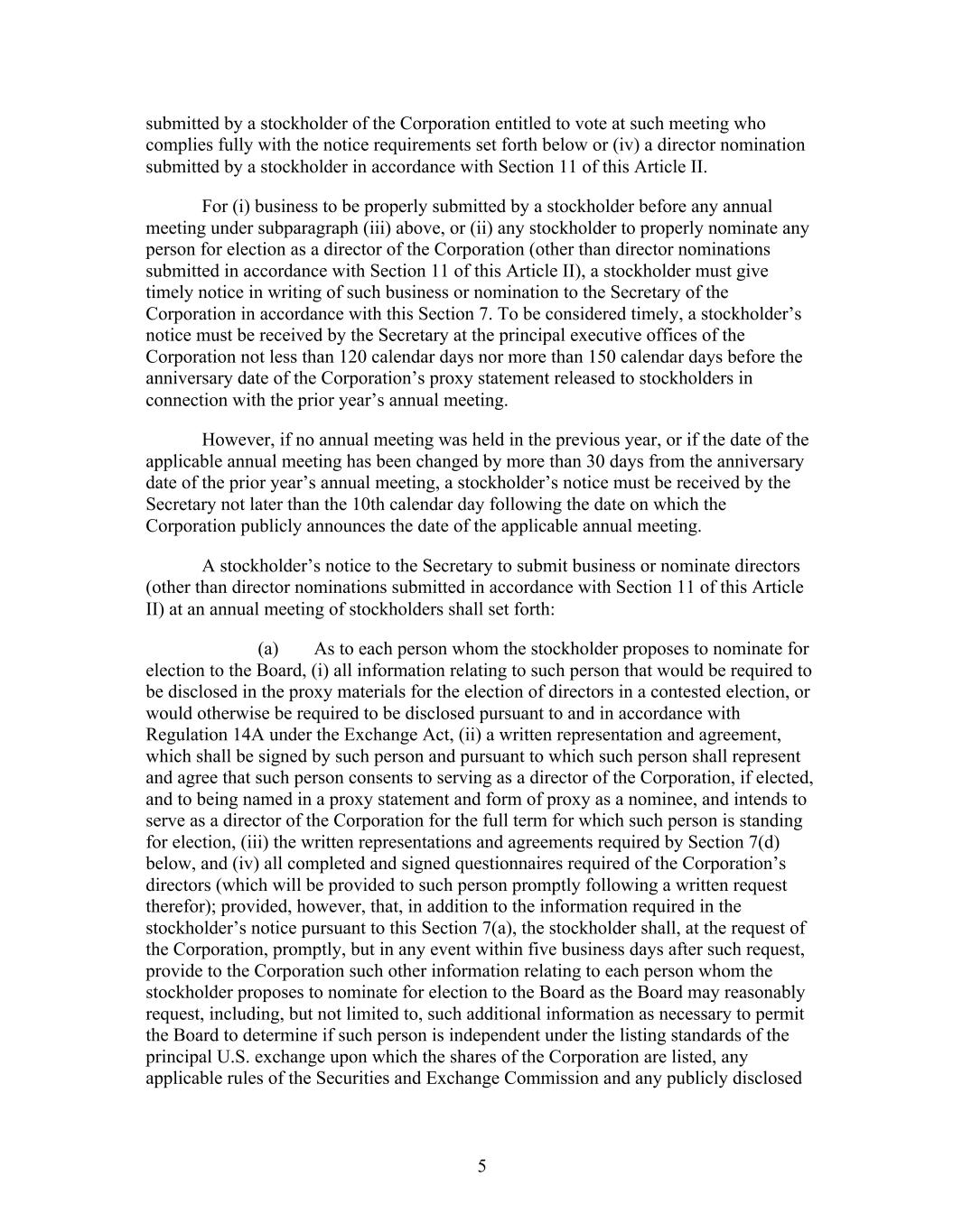 5由有权在该会议上投票的公司股东提交,且该股东完全遵守下文所载的通知要求,或(iv)股东根据本条第二款第11条提交的董事提名。(i)股东根据上文第(iii)款在任何周年会议前妥善提交的业务,或(ii)任何股东妥善提名任何人参选公司董事(根据本条第II条第11条提交的董事提名除外),股东必须按照本条第7条及时向公司秘书发出有关该业务或提名的书面通知。为被视为及时,秘书必须在公司就上一年度年会向股东发布的代理声明的周年日之前不少于120个日历日,也不超过150个日历日,在公司的主要执行办公室收到股东的通知。然而,如上一年度没有举行周年会议,或适用的周年会议日期较上一年度的周年会议日期有超过30天的更改,则秘书必须不迟于公司公开宣布适用的周年会议日期后的第10个日历日收到股东的通知。股东在股东年会上向秘书提交业务或提名董事(根据本条第二款第11款提交的董事提名除外)的通知,应载明:(a)关于股东提议提名参加董事会选举的每个人,(i)在有争议的选举中选举董事的代理材料中要求披露的与该人有关的所有信息,或根据《交易法》第14A条规定并按照第14A条规定要求披露的其他信息,(ii)书面陈述及协议,须由该人签署,并据此代表及同意该人如当选,同意担任公司董事,并同意在代表陈述及代表表格中以代名人的身份被提名,并拟在该人参选的整个任期内担任公司董事,(iii)下文第7(d)条规定的书面陈述及协议,及(iv)公司董事所需的所有填妥及签署的调查问卷(将在提出书面要求后立即提供予该人);但条件是,除根据本条第7(a)款在股东通知中所要求的资料外,股东须应公司的要求,迅速但无论如何在该要求后五个营业日内,向公司提供董事会合理要求的与股东提议提名参加董事会选举的每个人有关的其他资料,包括但不限于,允许董事会根据公司股票上市的主要美国交易所的上市标准、证券交易委员会的任何适用规则和任何公开披露的