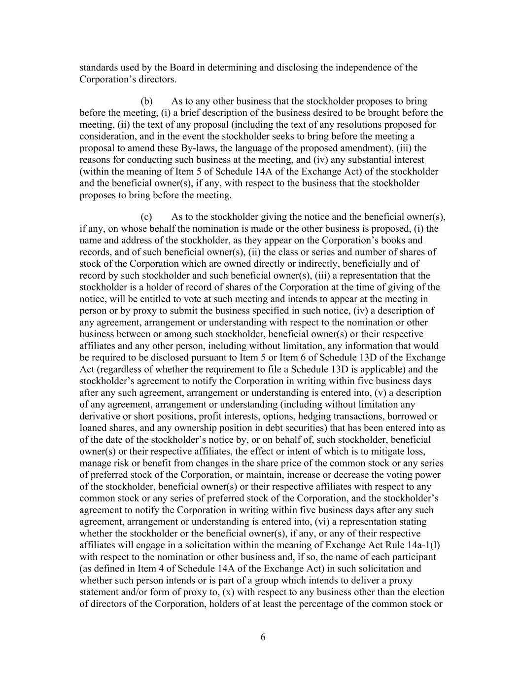 董事会在确定和披露公司董事独立性时使用的6项标准。(b)至于股东建议在会议前提出的任何其他业务,(i)希望在会议前提出的业务的简要说明,(ii)任何提案的文本(包括建议审议的任何决议的文本,以及如果股东寻求在会议前提出修订本附例的提案,则建议修订的语文),(iii)在会议上进行该等业务的理由,(四)股东和实益拥有人(如有的话)就股东提议提交会议的业务的任何实质性利益(在《交易法》附表14A第5项的含义内)。(c)就发出通知的股东及代其作出提名或建议其他业务的实益拥有人(如有的话)而言,(i)出现在公司簿册及纪录上的股东的名称及地址,以及该等实益拥有人的名称及地址,(ii)由该股东及该等实益拥有人直接或间接、实益拥有及记录的公司股份的类别或系列及数目,(iii)有关股东在发出通知时是公司股份纪录持有人的陈述,将有权在该会议上投票,并拟亲自或藉代理人出席会议,以呈交该通知所指明的业务,(iv)有关该股东、实益拥有人或其各自的联属公司与任何其他人之间或之间的提名或其他业务的任何协议、安排或谅解的描述,包括但不限于,根据《交易法》附表13D第5项或第6项(无论提交附表13D的要求是否适用)和股东同意在订立任何此类协议、安排或谅解后五个工作日内以书面形式通知公司而需要披露的任何信息,(v)对任何协议、安排或谅解的描述(包括但不限于任何衍生工具或空头头寸、利润权益、期权、对冲交易、借入或借出的股份,以及债务证券的任何所有权地位)截至股东发出通知之日已由或代表该股东、实益拥有人或其各自的关联公司订立,其效力或意图是减轻损失、管理风险或受益于公司普通股或任何系列优先股的股价变动,或维持、增加或减少股东、实益拥有人或其各自的关联公司对公司的任何普通股或任何系列优先股的投票权,及股东同意在订立任何该等协议、安排或谅解后五个营业日内以书面通知公司,(vi)声明股东或实益拥有人(如有的话)或其各自的任何关联公司是否将就提名或其他业务参与《交易法》第14a-1(l)条所指的招标,如有,此类招标中的每个参与者(定义见《交易法》附表14A第4项)的名称,以及该人是否打算或属于打算向(x)就公司董事选举以外的任何业务、至少普通股百分比的持有人或