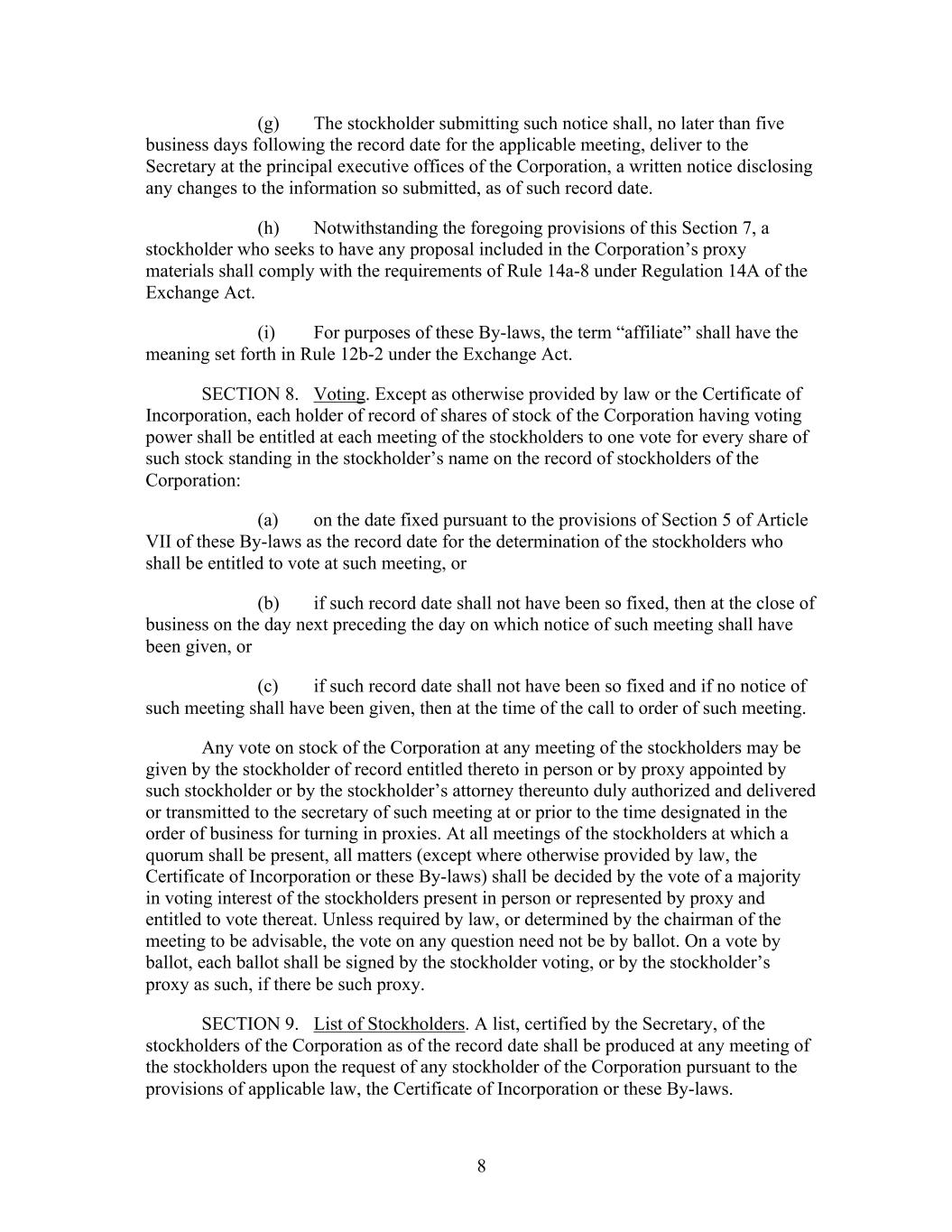 8(g)提交该通知的股东须在适用会议的记录日期后的五个营业日内,向公司主要执行办公室的秘书交付一份书面通知,披露自该记录日期起对如此提交的资料所作的任何更改。(h)尽管有本条第7款的上述规定,寻求将任何提案列入公司代理材料的股东应遵守《交易法》第14A条规定的第14a-8条的要求。(i)就本附例而言,“附属公司”一词应具有《交易法》第12b-2条规定的含义。第8节。投票。除法律或《公司注册证书》另有规定外,每名有表决权的公司股票记录持有人,在每次股东大会上,有权就公司股东记录上该股东名下的该股票的每一股份投一票:(a)在依据本附例第七条第5款的规定确定的日期,作为确定有权在该次会议上投票的股东的记录日期,或(b)如该记录日期并无如此确定,则在发出该会议通知的前一天的营业时间结束时,或(c)如该记录日期并无如此确定,且如没有发出该会议的通知,则在该会议的召集时。在股东的任何会议上对公司股票的任何投票,可由有权投票的记录股东亲自或由该股东委任的代理人或由该股东的授权代理人正式授权并在按业务顺序指定的上交代理人的时间或之前交付或传送给该会议的秘书。在出席达到法定人数的所有股东大会上,所有事项(除法律另有规定外,公司注册证书或本章程)均应由亲自出席或由代理人代表并有权在会上投票的股东以有表决权的多数票决定。除非法律要求,或会议主席认为可取,否则对任何问题的表决不必通过投票。在以投票方式表决时,每张选票应由股东投票签署,如有股东代理人,则应由股东代理人本人签署。第9节。股东名单。经秘书核证的公司截至记录日期的股东名单,须应公司任何股东根据适用法律、公司注册证书或本附例的规定提出的要求,在任何股东大会上出示。