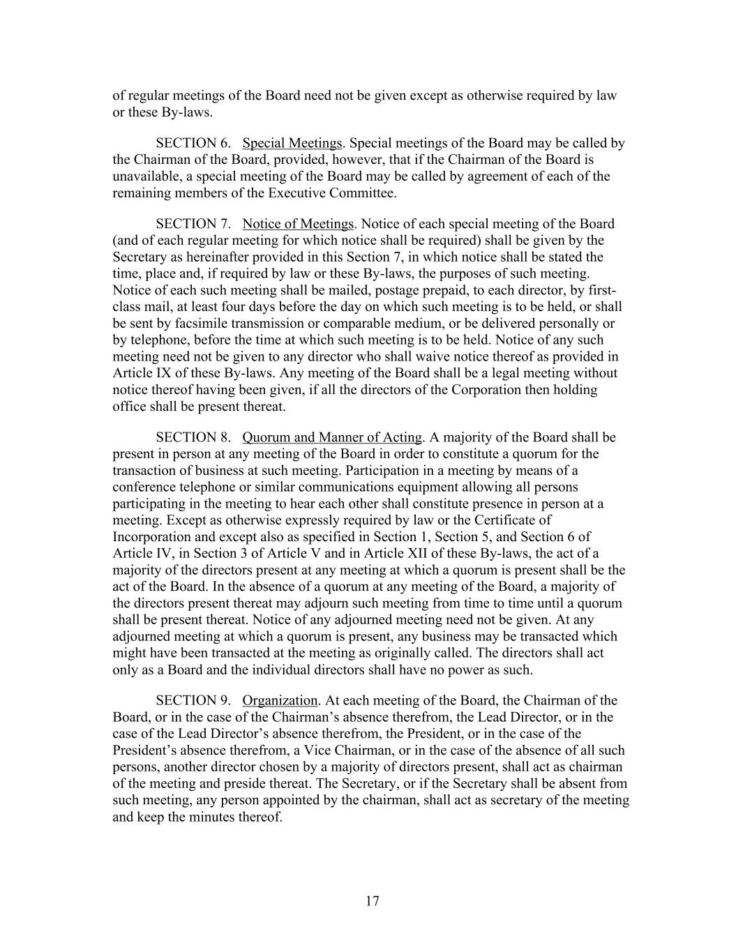 除法律或本附例另有规定外,董事会无需举行17次定期会议。第6节。特别会议。董事会主席可召集董事会特别会议,但如董事会主席不能出席,则可经执行委员会其余各成员同意召集董事会特别会议。第7节。会议通知。董事会每次特别会议(以及须发出通知的每次定期会议)的通知,须由秘书按本条第7款的以下规定发出,其中通知须述明时间、地点,如法律或本附例规定,则须述明该会议的目的。每次该等会议的通知,须在举行该等会议的日期至少四天前,以第一类邮件方式,邮寄给每名董事,并须预付邮资,或须在举行该等会议的时间前,以传真或类似媒介发出,或以亲自送达或电话送达。任何该等会议的通知无须按本附例第九条的规定给予任何须放弃通知的董事。董事会的任何会议,如公司当时的所有董事均须出席,即为合法会议,而无须发出通知。第8节。法定人数和行事方式。董事会的过半数成员应亲自出席董事会的任何会议,以构成在该会议上进行业务交易的法定人数。使用会议电话或类似通信设备参加会议,使参加会议的所有人能够相互听取意见,即构成亲自出席会议。除法律或法团注册证书另有明文规定外,亦除第四条第一节、第五节、第六节另有规定外,第五条第三节及本附例第十二条另有规定外,出席任何达到法定人数的会议的过半数董事的行为,即为董事会的行为。如董事会的任何会议未能达到法定人数,出席会议的过半数董事可不时将该会议延期,直至达到出席会议的法定人数为止。任何续会的通知无须发出。在出席的任何达到法定人数的续会上,可处理原本可能在会议上处理的任何事务。董事仅作为董事会行事,个别董事无权这样做。第9节。组织。在每次董事会会议上,董事会主席,或在主席缺席的情况下,由首席董事,或在首席董事缺席的情况下,由总裁,或在总裁缺席的情况下,由副董事长,或在所有该等人士缺席的情况下,由出席董事过半数选出的另一名董事,代行会议主席并主持会议。秘书,或如秘书缺席该会议,则由主席委任的任何人,须代行会议秘书的职责,并保存会议记录。