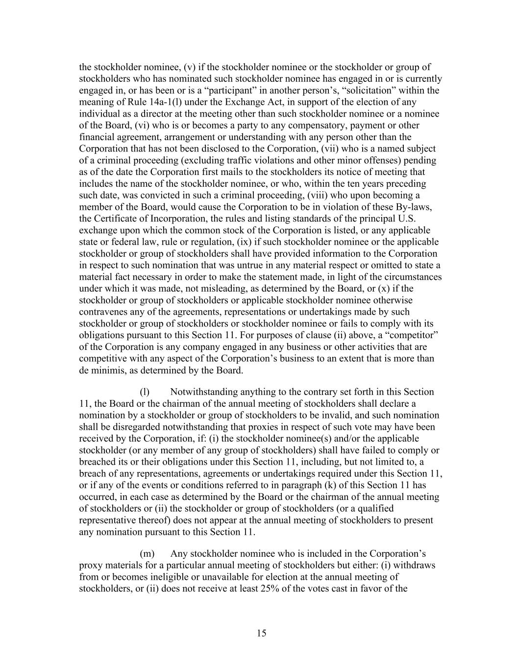 15股东代名人,(v)如果股东代名人或提名该股东代名人的股东或股东群体已经或正在从事,或已经或现在是另一人的“参与者”,根据《交易法》第14a-1(l)条的含义,以支持在会议上选举除该股东代名人或董事会代名人以外的任何个人为董事,(vi)是或成为任何补偿、付款或其他财务协议的一方,与公司以外任何未向公司披露的人作出的安排或谅解,(vii)截至公司首次向股东邮寄其包括股东代名人姓名的会议通知之日,该人是刑事诉讼的指定主体(不包括交通违法和其他轻微罪行),或在该日期前十年内在该刑事诉讼中被定罪的人,(viii)在成为董事会成员时,将导致公司违反这些章程,即公司注册证书,公司普通股上市的主要美国交易所的规则和上市标准,或任何适用的州或联邦法律、规则或条例,(ix)如果该股东提名人或适用的股东或股东集团应已就该提名向公司提供了在任何重大方面不真实的信息,或未说明必要的重大事实,以便根据作出该提名的情况作出所作的陈述,而不是由董事会确定的误导,或(x)如股东或股东团体或适用的股东代名人以其他方式违反该股东或股东团体或股东代名人作出的任何协议、陈述或承诺,或未能遵守其根据第11条承担的义务。就上文第(ii)条而言,公司的“竞争对手”是指从事任何业务或其他活动的公司,这些业务或活动与公司业务的任何方面具有竞争性,其程度超过董事会所确定的最低限度。(l)即使本第11条另有相反规定,董事会或股东年会主席须宣布任何股东或股东团体的提名无效,而即使公司可能已收到有关该投票的代理人,该提名亦须不予理会,但如:(i)股东代名人和/或适用的股东(或任何股东团体的任何成员)未能遵守或违反其根据本第11条所承担的义务,包括但不限于,违反根据第11条规定的任何陈述、协议或承诺,或如已发生本第11条(k)段所指的任何事件或条件,则在每宗个案中均由董事会或股东年会主席决定,或(ii)股东或股东团体(或其合资格代表)没有出席股东年会,以根据第11条提出任何提名。(m)任何股东代名人如被列入公司为某一股东年会的代理材料,但以下任一情况:(i)退出或变得没有资格或无法在股东年会上进行选举,或(ii)没有获得至少25%的赞成票