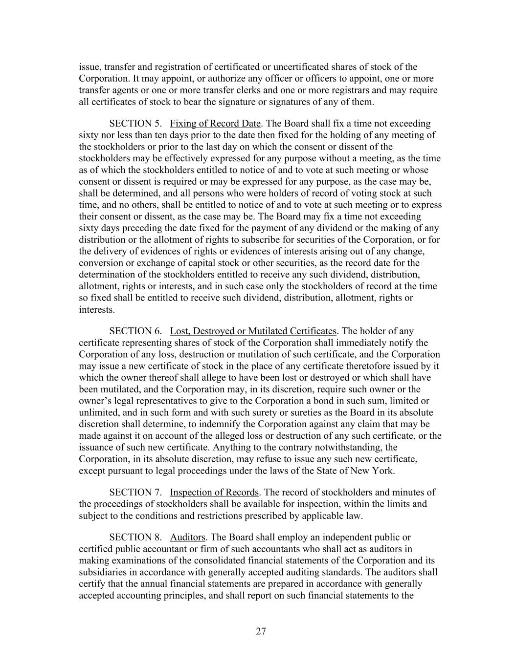27发行、转让、登记公司经证明或未证明的股票。委员会可委任或授权任何高级人员或高级人员委任一名或多于一名转让代理人或一名或多于一名转让书记员及一名或多于一名登记官,并可要求所有股票证书须载有其中任何一人的签字或签署。第5节。确定记录日期。董事会须在当时为举行任何股东大会而订定的日期前,或在未经会议而可为任何目的有效表达股东的同意或异议的最后一天前,订定一段不超过六十天或不少于十天的时间,作为有权在该会议上获得通知及投票的股东,或其同意或异议被要求或为任何目的(视属何情况而定)表达的时间,及所有在该时间有表决权股份纪录持有人的人,而无其他人,均有权获得该会议的通知及在该会议上投票,或表达其同意或异议(视属何情况而定)。董事会可在为支付任何股息或作出任何分派或配发认购公司证券的权利,或交付因股本或其他证券的任何变更、转换或交换而产生的权利证据或利益证据而订定的日期前订定不超过六十天的时间,作为确定有权收取任何该等股息、分派、配发、权利或利益的股东的记录日期,在这种情况下,只有在如此确定的时间登记在册的股东才有权获得此类股息、分配、配股、权利或权益。第6节。遗失、毁损或残损的证明。代表公司股份的任何证明书的持有人须立即将该证明书的遗失、毁损或毁损通知公司,而公司可发出新的股份证明书,以代替其发出的任何证明书,而该证明书的拥有人须指称已遗失或毁损,或该证明书须毁损,而公司可酌情规定该拥有人或该拥有人的法定代理人向公司提供该等金额的有限制或无限制的保证金,及以委员会绝对酌情决定权所决定的形式及与一名或多于一名保证人合作,就任何该等证明书所指称的遗失或毁损,或发出该等新证明书而可能向公司提出的任何申索,向公司作出弥偿。尽管有任何相反的情况,公司可根据其绝对酌处权拒绝签发任何此类新证书,但根据纽约州法律进行的法律程序除外。第7节。查阅记录。股东记录和股东议事记录应在适用法律规定的条件和限制范围内供查阅。第8节。审计员。董事会按照公认审计准则对公司及子公司合并财务报表进行审核时,董事会应聘请独立的公共或注册会计师或此类会计师事务所担任审计师。审计人员应当证明年度财务报表是按照公认会计原则编制的,并就该等财务报表向