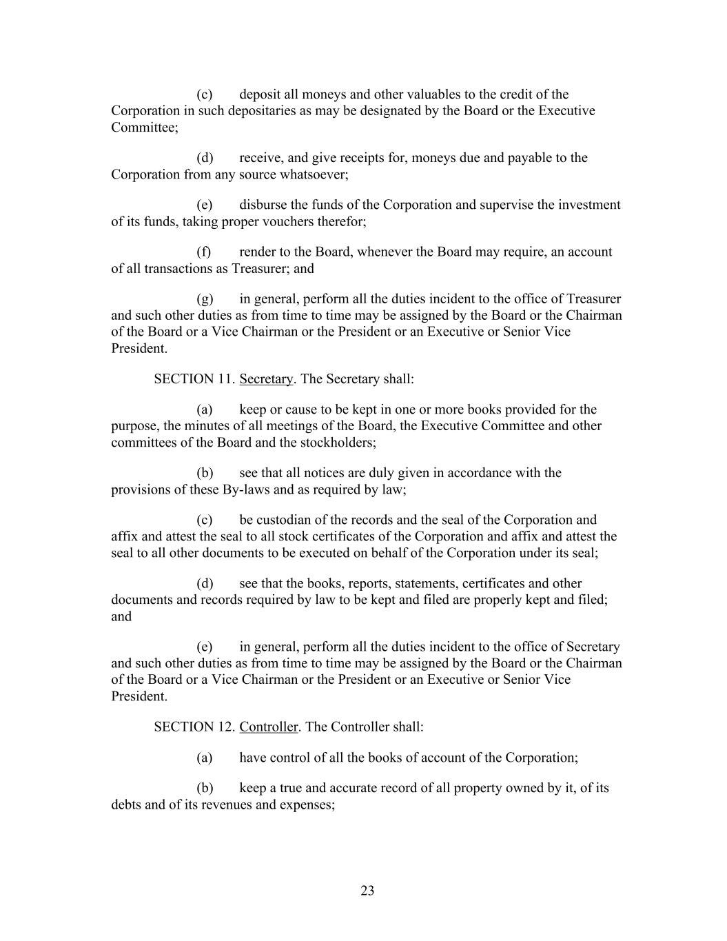 23(c)将公司所有款项及其他贵重物品存入管理局或执行委员会指定的保存人的贷方;(d)从任何来源收取公司到期应付款项,并为其提供收据;(e)支付公司资金并监督其资金的投资,并为此采取适当的凭单;(f)在管理局可能要求时,以司库身份向管理局提供所有交易的帐目;及(g)一般而言,履行所有发生在财务主任办公室的职责以及董事会或董事会主席或副主席或总裁或执行或高级副总裁可能不时指派的其他职责。第11节。秘书。秘书须:(a)将管理局所有会议的会议纪录备存或安排备存于为此目的而提供的一份或多于一份簿册内,董事会的执行委员会及其他委员会及股东;(b)见所有通知均按照本附例的条文及法律规定妥为发出;(c)为公司的纪录及印章的保管人,并在公司的所有股份证明书上加盖及证明印章,并在其盖章下为代表公司签立的所有其他文件上加盖及证明印章;(d)见账簿、报告、报表,法律规定须备存及存档的证明书及其他文件及纪录,均须妥善备存及存档;及(e)一般而言,履行董事会或董事会主席或一名副主席或总裁或一名执行或高级副总裁不时委派的所有职责及其他职责。第12节。控制器。财务总监应:(a)对公司的所有账簿拥有控制权;(b)对其拥有的所有财产、其债务及其收入和支出保持真实、准确的记录;