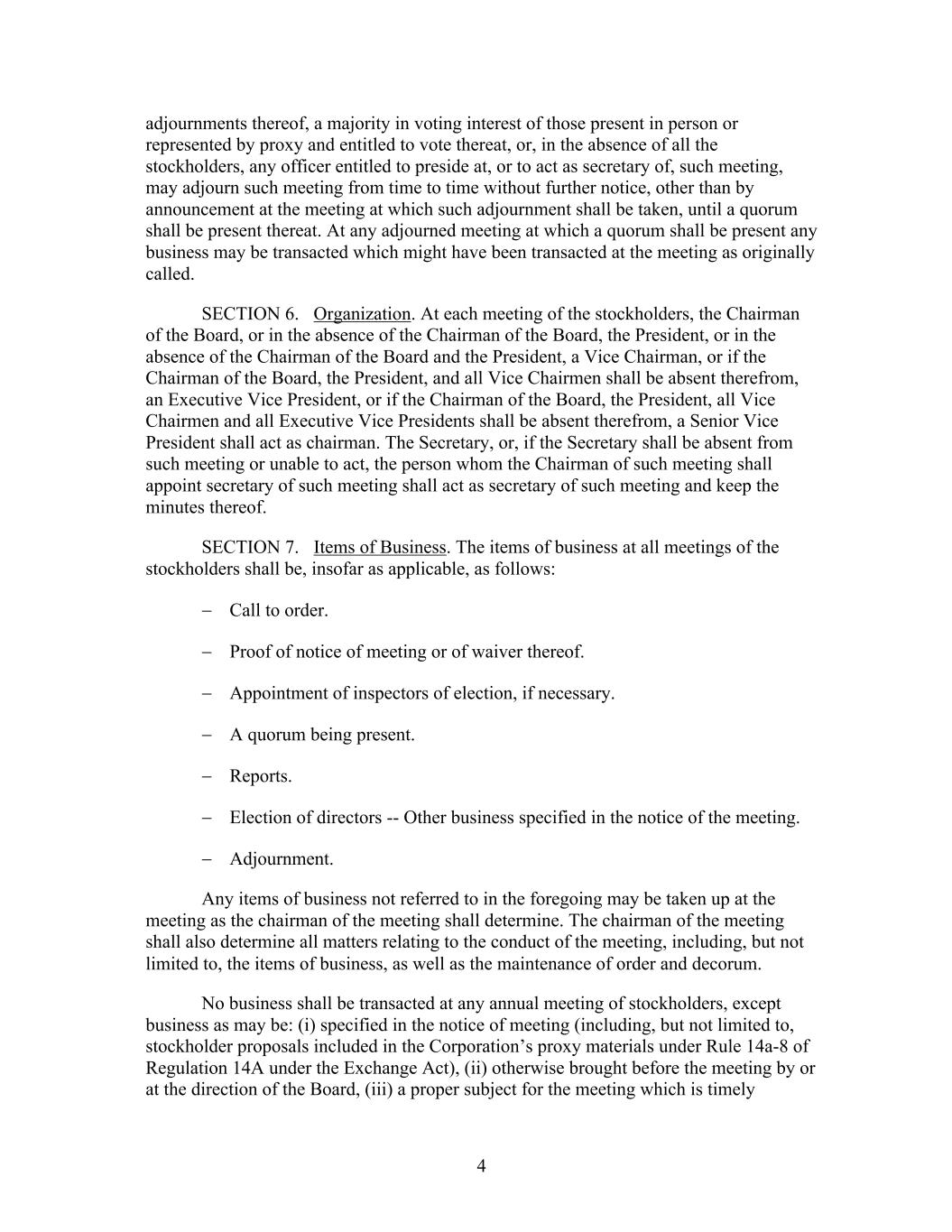 4次休会,以亲自出席或由代理人代表并有权在会上投票的人士的过半数投票权,或在全体股东缺席的情况下,任何有权主持该会议或担任该会议秘书的高级人员,可不时休会,而无须另行通知,除非在应举行该休会的会议上宣布,直至达到法定人数为止。在法定人数出席的任何续会上,可处理原本可能在会议上处理的任何事务。第6节。组织。在每次股东大会上,董事长或董事长、董事长缺席时,或董事长、总裁缺席时,由一名副董事长出席,或董事长、总裁、全体副董事长缺席时,由一名常务副总裁出席,或董事长、总裁、全体副董事长、全体常务副总裁缺席时,由一名高级副总裁代行董事长职务。秘书,或如秘书缺席该会议或无法行事,则由该会议主席委任该会议秘书的人担任该会议的秘书,并保存会议记录。第7节。业务项目。所有股东大会的议事项目,在适用的范围内,如下:----按顺序召开。-会议通知或放弃通知的证明。-必要时任命选举视察员。-出席人数达到法定人数。-报告。-选举董事--会议通知规定的其他事项。-休会。凡有前述未提及的事项,可由会议主席决定在会议上处理。会议主席还应决定与会议进行有关的所有事项,包括但不限于事务项目以及维持秩序和礼仪。任何年度股东大会均不得处理任何事务,但以下情况除外:(i)会议通知中指明的事务(包括但不限于根据《交易法》第14A条第14a-8条规定的公司代理材料中包含的股东提案),(ii)由董事会或在董事会指示下以其他方式提交给会议,(iii)会议的适当主题是及时的