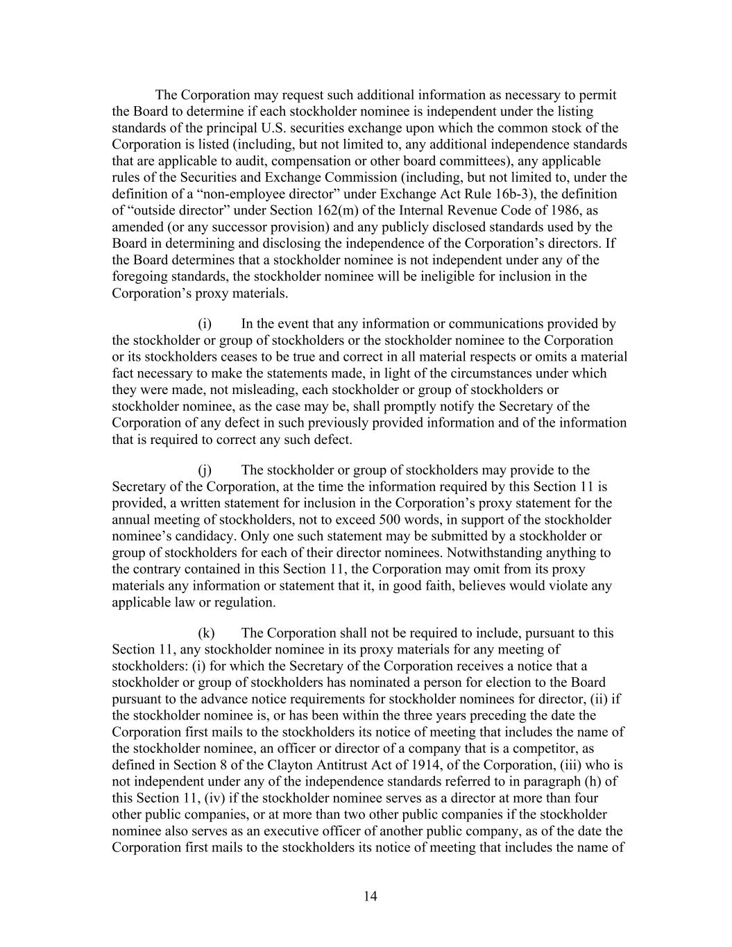14公司可要求提供必要的额外信息,以允许董事会根据公司普通股上市的主要美国证券交易所的上市标准(包括但不限于适用于审计、薪酬或其他董事会委员会的任何额外独立性标准)、证券交易委员会的任何适用规则(包括但不限于根据《交易法》第16b-3条“非雇员董事”的定义)确定每个股东提名人是否独立,经修订(或任何后续条款)的1986年《国内税收法》第162(m)节下的“外部董事”定义,以及董事会在确定和披露公司董事独立性时使用的任何公开披露的标准。如果董事会确定根据上述任何标准,股东提名人不是独立的,则该股东提名人将没有资格被列入公司的代理材料。(i)如股东或股东团体或股东代名人向公司或其股东提供的任何资料或通讯在所有重大方面不再真实和正确,或忽略作出所作陈述所需的重大事实,根据作出该等陈述的情况,而非误导每名股东或股东团体或股东代名人(视属何情况而定),须将该等先前提供的资料中的任何缺陷及纠正任何该等缺陷所需的资料,迅速通知公司秘书。(j)股东或股东团体可在提供本条第11条所规定的资料时,向公司秘书提供一份书面陈述,以载入公司在股东周年大会上的代理声明,内容不超过500字,以支持股东代名人的候选资格。一个股东或一组股东只能为其每一位董事提名人提交一份此类声明。尽管本条第11条载有任何相反的规定,公司仍可在其代理资料中省略其真诚地认为会违反任何适用法律或规例的任何资料或陈述。(k)根据本条第11条,公司无须将任何股东代名人列入其出席任何股东大会的代理材料中:(i)如公司秘书接获通知,表示任何股东或股东集团已根据股东提名董事的预先通知规定提名一人参选董事会,(ii)如该股东代名人是,或已在公司首次向股东邮寄其会议通知之日之前的三年内,其中包括股东提名人、公司的高级管理人员或董事的姓名,该公司是1914年《克莱顿反托拉斯法》第8条所定义的竞争对手,(iii)根据本第11条(h)段所述的任何独立性标准不是独立的,(iv)如果股东提名人在超过四家其他上市公司担任董事,或在其他两家以上的公众公司,如果股东提名人同时担任另一家公众公司的执行官,则自公司首次向股东邮寄其会议通知之日起,其中包括