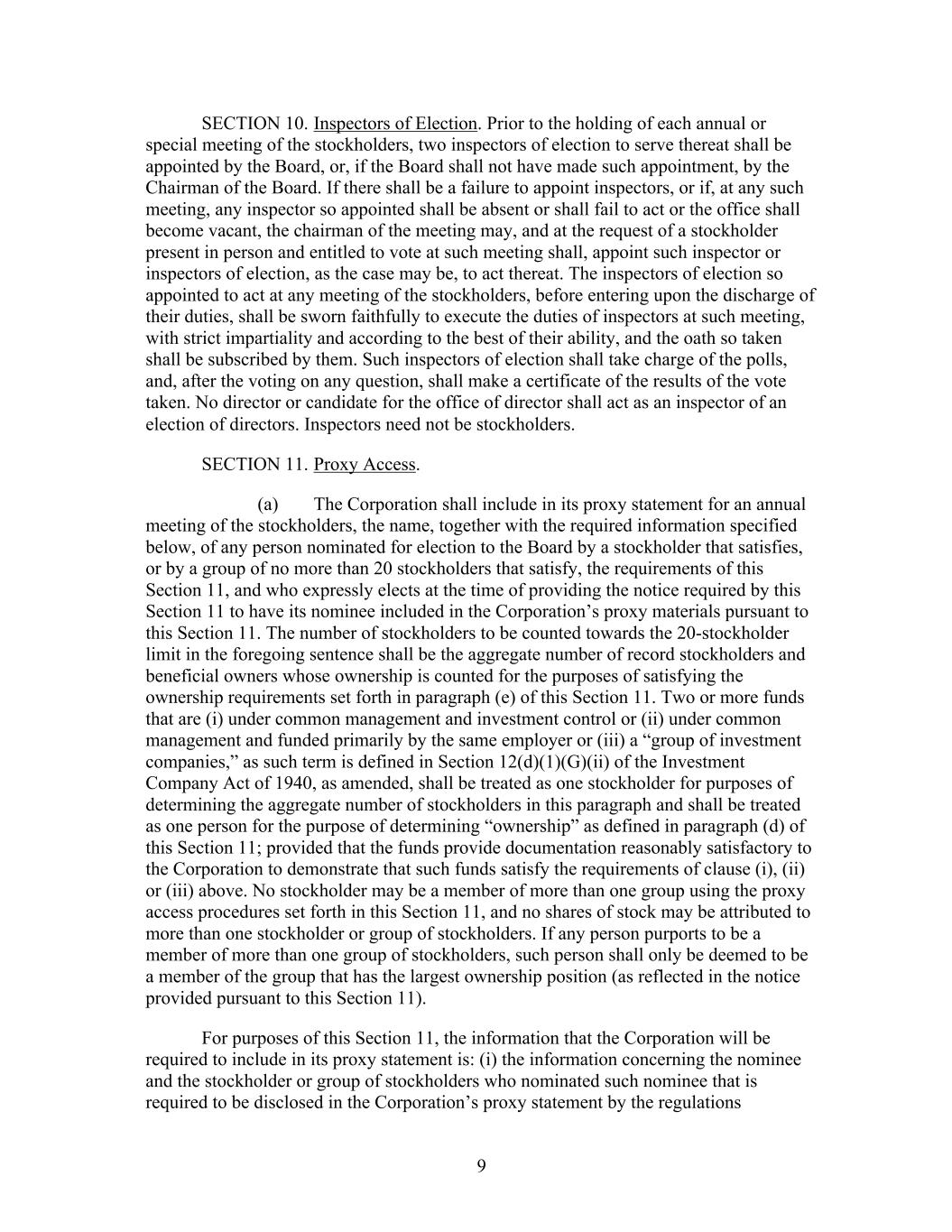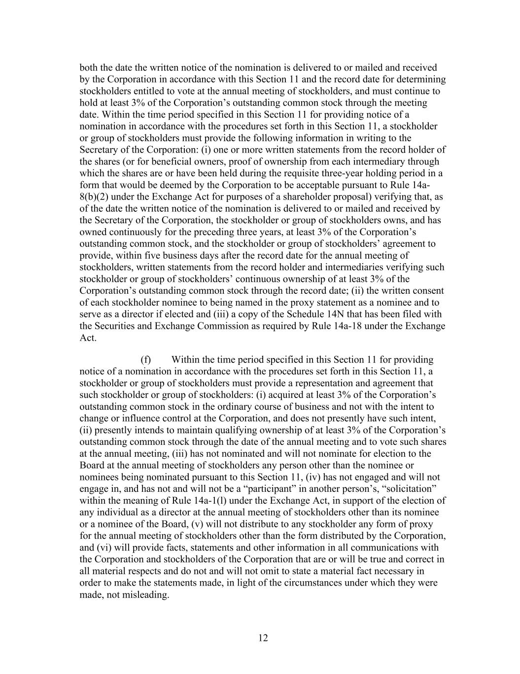 12提名的书面通知根据本条第11款送达或邮寄并由公司收到的日期和确定有权在股东年会上投票的股东的记录日期,并且必须在会议日期之前继续持有至少3%的公司已发行普通股。在根据本条第11款规定的程序提供提名通知的本条第11款规定的期限内,股东或股东团体必须向公司秘书提供以下书面资料:(i)股份记录持有人(或实益拥有人)的一份或多份书面陈述,根据《交易法》第14a-8(b)(2)条规则,为股东提案的目的,公司认为可接受的形式在必要的三年持有期内通过或已经通过其持有股份的每个中间人提供的所有权证明)核实,截至提名的书面通知送达或邮寄并由公司秘书收到之日,该股东或股东集团拥有并在过去三年内连续拥有至少3%的公司已发行普通股,及股东或股东团体同意,在股东周年大会记录日后的五个营业日内,记录持有人和中介机构的书面声明,核实该股东或股东群体在记录日期之前至少持续拥有公司已发行普通股的3%;(ii)每个股东被提名人书面同意在代理声明中被指定为被提名人并在当选后担任董事,以及(iii)根据《交易法》第14a-18条规则的要求已向证券交易委员会提交的附表14N的副本。(f)在根据本条第11条所列程序提供提名通知的本条第11条所指明的期限内,股东或股东集团必须提供一份陈述和协议,说明该股东或股东集团:(i)在正常业务过程中取得公司至少3%的已发行普通股,而并非意图改变或影响对公司的控制权,且目前并无此种意图,(ii)目前打算在年度会议日期之前保持至少3%的公司已发行普通股的合格所有权,并在年度会议上对这些股份进行投票,(iii)没有提名也不会在股东年会上提名除根据本第11条被提名的被提名人或被提名人以外的任何人参加董事会选举,(iv)没有参与、也不会参与、也不会“参与”另一人的《交易法》第14a-1(l)条所指的“邀约”,为支持除其代名人或董事会代名人以外的任何个人在股东年会上当选为董事,(v)将不会向任何股东分发除公司分发的表格以外的任何形式的股东年会代理,并且(vi)将提供事实,与公司和公司股东的所有通信中的陈述和其他信息,这些信息在所有重大方面是或将是真实和正确的,并且没有也不会遗漏陈述必要的重要事实,以便根据作出这些陈述的情况作出这些陈述,而不是误导。