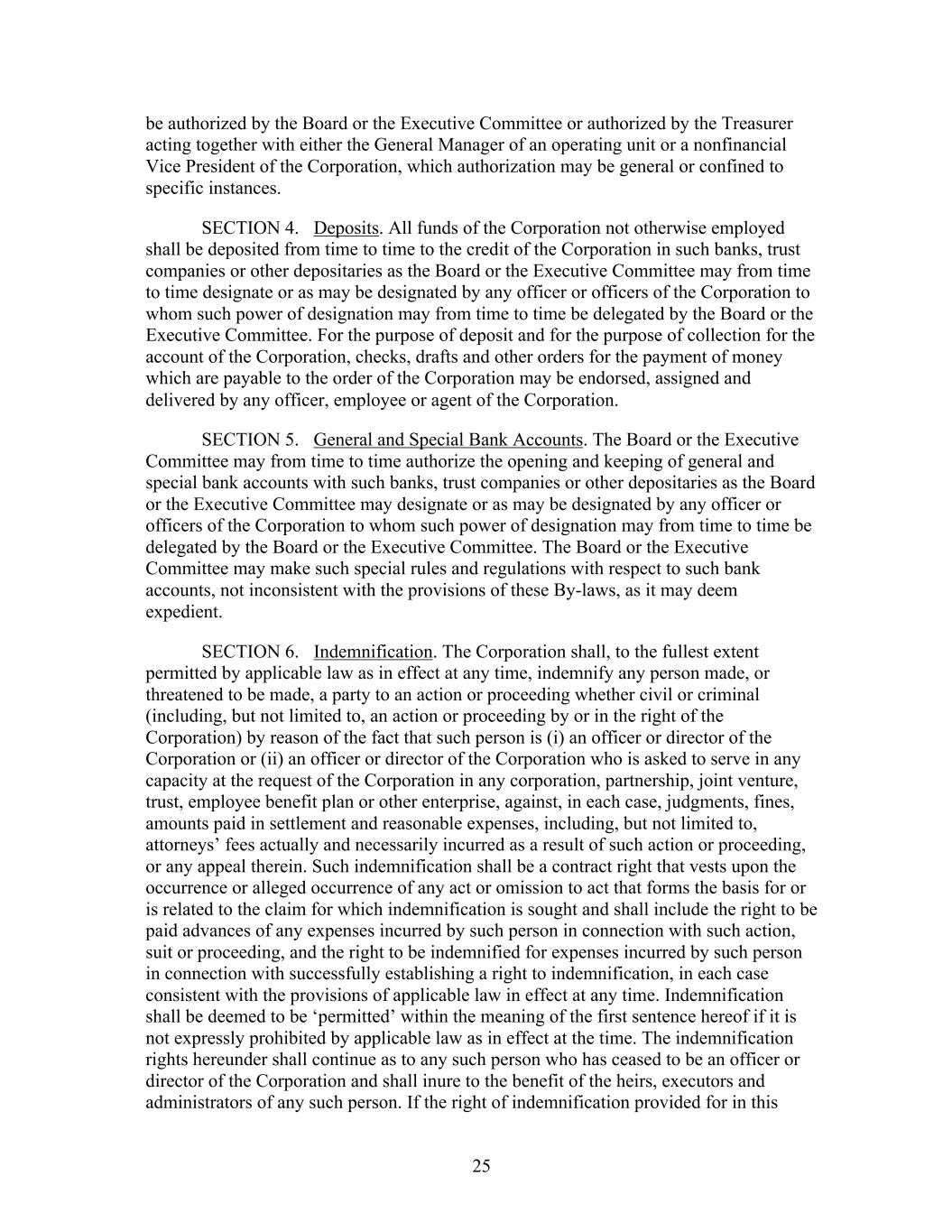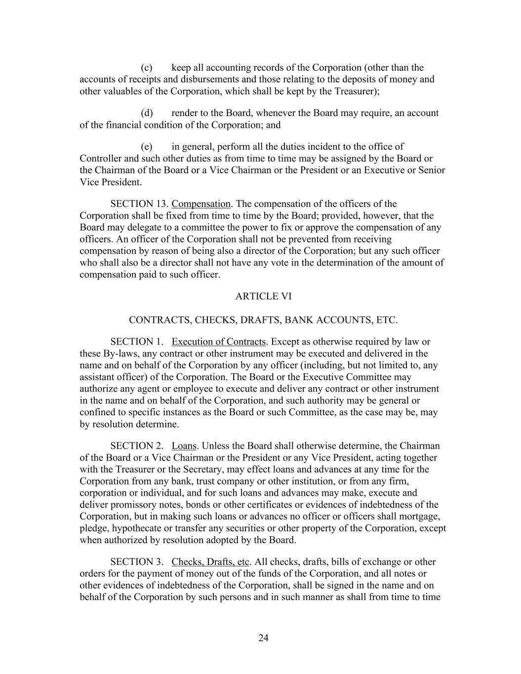 24(c)备存公司的所有会计纪录(收支帐目及与公司的款项及其他贵重物品的存款有关的帐目除外,而该等帐目须由财务主任备存);(d)每当董事会要求时,向董事会提交有关公司财务状况的帐目;及(e)一般而言,履行发生在财务总监办公室的所有职责以及董事会或董事长或副董事长或总裁或执行或高级副总裁可能不时委派的其他职责。第13节。赔偿。公司高级人员的薪酬须由管理局不时厘定;但管理局可将厘定或批准任何高级人员的薪酬的权力转授委员会。公司的高级人员不得因兼任公司董事而被阻止领取补偿;但任何该等高级人员亦须兼任董事,在厘定向该高级人员支付的补偿款额时,不得有任何表决权。第六条合同、支票、汇票、银行账户等。第1节。合同的执行。除法律或本附例另有规定外,任何合约或其他文书可由公司任何高级人员(包括但不限于任何助理人员)以公司名义及代表公司签立及交付。管理局或执行委员会可授权任何代理人或雇员以公司名义及代表公司签立及交付任何合约或其他文书,而该等授权可属一般或限于管理局或执行委员会(视属何情况而定)藉决议厘定的特定情况。第2节。贷款。除非董事会另有决定,董事会主席或一名副主席或总裁或任何副总裁,连同司库或秘书,可随时为公司向任何银行、信托公司或其他机构,或向任何商号、法团或个人发放贷款及垫款,而就该等贷款及垫款,可作出、签立及交付公司的本票、债券或其他债务证明或证据,但在作出该等贷款或垫款时,任何高级人员或高级人员不得抵押、质押,抵押或转让公司的任何证券或其他财产,除非经董事会通过的决议授权。第3节。支票、汇票等所有从公司资金中支付款项的支票、汇票、汇票或其他命令,以及公司所有负债的票据或其他证据,均须由该等人士以公司名义及代表公司签署,并须按不时