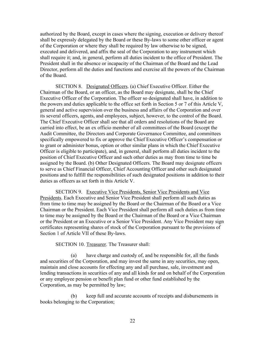 22获委员会授权,但如签署、签立或交付该等文件须由委员会或本附例明确转授予公司的其他高级人员或代理人,或法律另有规定须签署、签立及交付该等文件,并在任何须予签署、签立及交付的文书上加盖公司印章,则属例外;及一般而言,须履行与总裁职位有关的所有职责。董事长和首席董事不在或不能任职时,总裁应履行董事长的一切职责和职能,行使董事长的一切权力。第8节。指定人员。(a)首席执行官。董事会主席或董事会指定的高级职员任一为公司行政总裁。如此指定的高级人员,除具有本条第五条或第七条所列适用于该职位的权力和职责外,对公司的业务和事务以及对其若干高级人员、代理人和雇员的一般和主动监督,但须受董事会的控制。首席执行官应确保董事会的所有命令和决议生效,成为董事会所有委员会的当然成员(审计委员会、董事和企业管治委员会以及特别有权确定或批准首席执行官薪酬或授予或管理首席执行官有资格参与的奖金、期权或其他类似计划的委员会除外),并且,一般来说,须履行与行政总裁职位有关的所有职责及董事会不时分派的其他职责。(b)其他指定人员。董事会可以指定高级职员担任首席财务官、首席财务官等指定职务并履行本条第五条第九款规定的高级职员职责外的指定职务职责。常务副总裁、高级副总裁、副总裁。每位执行和高级副总裁应履行董事会或董事长或副董事长或总裁不时委派的所有职责。每位副总裁应履行董事会或董事长或副董事长或总裁或执行或高级副总裁不时委派的所有职责。任何副总裁可依据本附例第七条第一款的规定签署代表公司股份的证书。第10节。财务主管。司库须:(a)对公司的所有资金及证券进行押记及保管,并对其负责,并可将该等资金及证券投资于任何证券,可为公司或公司设立的任何雇员退休金或福利计划基金或法律许可的其他基金开立、维持及关闭账户,以进行任何及所有购买、出售、投资及出借证券交易;(b)在属于公司的簿册内备存完整及准确的收支帐目;