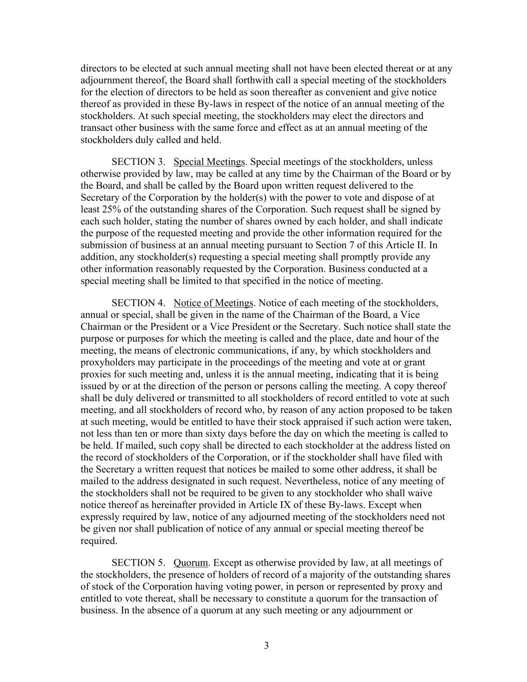 3名董事须在该年度会议上选出,不得在该年度会议上或在其任何续会上选出,董事会须随即召开股东特别会议,以便在其后尽快举行董事选举,并就股东周年会议的通知发出本附例所规定的通知。在该特别会议上,股东可以选举董事和办理其他事务,其效力和效力与适当召集和召开的股东年会相同。第3节。特别会议。股东特别会议,除法律另有规定外,可由董事会主席或董事会随时召集,并须由董事会在有权投票及处置公司至少25%已发行股份的持有人向公司秘书提出书面要求后召集。此种请求应由每个此类持有人签署,说明每个持有人拥有的股份数量,并应表明所请求的会议的目的,并提供根据本条第二款第7款在年度会议上提交业务所需的其他信息。此外,任何要求召开特别会议的股东应迅速提供公司合理要求的任何其他信息。在特别会议上进行的业务应限于会议通知中规定的业务。第4节。会议通知。每次股东大会的通知,年度或特别会议,应以董事长、副董事长或总裁或副总裁或秘书的名义发出。该通知应说明召集会议的目的和会议的地点、日期和时间、电子通信手段(如有的话),股东和代理持有人可借此参加会议的程序并在该会议上投票或授予该会议的代理人,并且(除非是年度会议)表明该通知是由召集会议的人或在召集会议的人的指示下发出的。其副本应妥为交付或传送给有权在该会议上投票的所有在册股东,以及因在该会议上拟采取的任何行动而有权在该会议上采取该行动的情况下对其股票进行评估的所有在册股东,不少于召开会议之日的十天或六十天以上。如邮寄,该等副本须按公司股东纪录所列的地址发给每名股东,或如该股东已向秘书提出将通知邮寄至其他地址的书面要求,则须邮寄至该要求所指定的地址。尽管如此,任何股东大会的通知,不得按本章程下文第IX条的规定,要求给予任何放弃通知的股东。除法律明文规定的情况外,无须发出任何股东续会的通知,亦无须刊发任何股东周年大会或特别大会的通知。第5节。法定人数。除法律另有规定外,在股东的所有会议上,有表决权的公司已发行股票过半数的记录持有人亲自出席或由代理人代表出席并有权在会上投票,对构成业务交易的法定人数是必要的。在任何该等会议或任何休会时未达到法定人数或