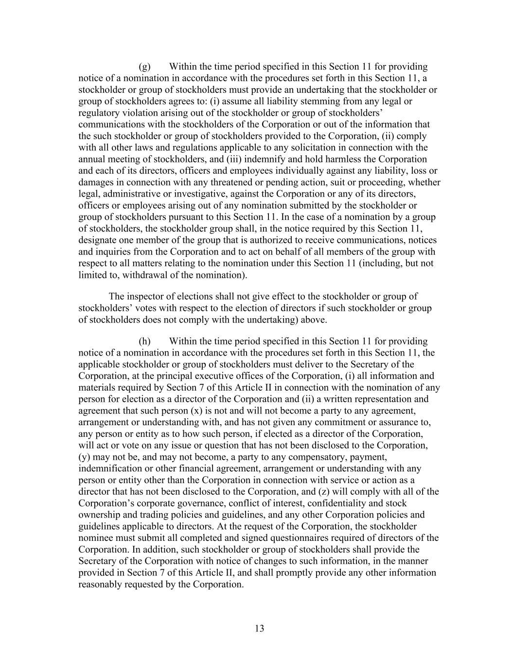 13(g)在本条第11款规定的按照本条第11款规定的程序提供提名通知的期限内,股东或股东集团必须提供一项承诺,即该股东或股东集团同意:(i)承担因该股东或股东集团与公司股东的通信或因该股东或股东集团向公司提供的信息而产生的任何法律或监管违规行为所产生的全部责任,(ii)遵从适用于与股东年会有关的任何邀约的所有其他法律及规例,及(iii)就股东或股东集团依据第11条提交的任何提名而对公司或其任何董事、高级人员或雇员产生的与任何威胁或待决诉讼、诉讼或程序(不论是法律、行政或调查)有关的任何法律责任、损失或损害,向公司及其每名董事、高级人员及雇员个别作出弥偿及使其免受损害。如属一组股东的提名,股东集团须在本条第11条规定的通知中,指定一名获授权接收公司的通讯、通知及查询的集团成员,并就与根据本条第11条的提名有关的所有事宜(包括但不限于撤回提名)代表集团所有成员行事。选举督察员如不遵守上述承诺,则不得对该股东或股东群体就董事选举进行投票。(h)在根据本条第11条所列程序提供提名通知的本条第11条所指明的期限内,适用的股东或股东团体必须在公司的主要执行办公室向公司秘书交付,(i)本条第II条第7条所规定的与提名任何人参选公司董事有关的所有资料及资料,以及(ii)书面陈述及协议,证明该人(x)不是、也不会成为与任何人或实体订立的任何协议、安排或谅解的一方,亦没有向该人或实体作出任何承诺或保证,说明该人如当选为公司董事,将如何就未向公司披露的任何议题或问题行事或投票,(y)不得且不得成为与公司以外的任何人或实体就未向公司披露的作为董事的服务或行动而订立的任何补偿、付款、赔偿或其他财务协议、安排或谅解的一方,及(z)将遵守公司的所有公司治理、利益冲突、保密和股份所有权及交易政策及指引,以及适用于董事的任何其他公司政策及指引。应公司要求,股东提名人必须提交公司董事要求的所有填妥和签署的调查问卷。此外,该股东或股东团体须按本条第二款第7款规定的方式,向公司秘书提供有关该等资料的更改通知,并应迅速提供公司合理要求的任何其他资料。