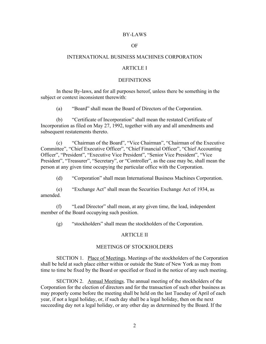 2国际商业机器公司附例第一条本附例中的定义,并就本附例的所有目的而言,除非在主题或上下文中有与之不一致的东西:(a)“董事会”系指公司的董事会。(b)“公司注册证书”系指于1992年5月27日提交的经重述的公司注册证书,连同对其的任何及所有修订及随后的重述。(c)“董事会主席”、“副主席”、“执行委员会主席”、“首席执行官”、“首席财务官”、“首席财务官”、“总裁”、“执行副总裁”、“高级副总裁”、“副总裁”、“副总裁”、“财务主管”、“秘书”或“财务总监”(视情况而定),系指在任何特定时间在公司担任特定职务的人。(d)“公司”是指国际商业机器公司。(e)“交易法”是指经修订的《1934年证券交易法》。(f)“牵头董事”是指在任何特定时间担任该职位的牵头、独立的董事会成员。(g)“股东”是指公司的股东。第二条股东大会第一节。会议地点。公司股东的会议应在纽约州境内或境外由董事会不时确定或在任何此类会议的通知中指明或确定的地点举行。第2节。年度会议。为选举董事和处理会议之前可能适当进行的其他事务而举行的公司股东年会,如不是法定假日,则应在每年4月的最后一个星期二举行,如该日为法定假日,则应在翌日不是法定假日,或在董事会确定的任何其他日子举行。如果