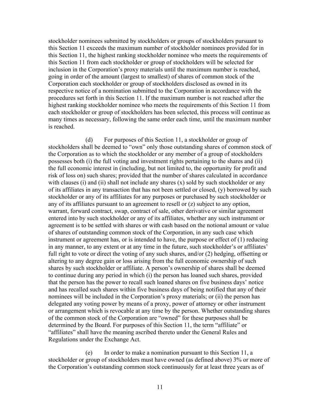 11名股东或股东群体根据第11条提交的股东提名人超过第11条规定的股东提名人的最大数量,将从每个股东或股东群体中选出符合第11条要求的排名最高的股东提名人列入公司的代理材料,直至达到最大数量,按照按照第11条规定的程序在其各自提交给公司的提名通知中披露为拥有的每个股东或股东集团的公司普通股股份的数量(最大到最小)排序。如果在从每个股东或股东群体中选出符合本第11条要求的最高排名的股东提名人后,仍未达到最大数量,这一过程将继续进行必要的多次,每次遵循相同的顺序,直至达到最大数量。(d)就本条而言,股东或股东集团须当作只“拥有”公司普通股的未发行股份,而该股东或股东集团的任何成员同时拥有(i)与该股份有关的充分投票权和投资权,以及(ii)在(包括但不限于,)该等股份的获利机会及亏损风险;但根据第(i)及(ii)条计算的股份数目,不得包括该股东或其任何联属公司在任何交易中出售的任何股份(x),而该交易尚未结清或结清,(y)该股东或其任何联属公司为任何目的借入或由该股东或其任何联属公司根据转售协议购买或(z)受任何期权、认股权证、远期合约、掉期、销售合约规限,该股东或其任何关联公司订立的其他衍生协议或类似协议,无论任何此类文书或协议是根据公司已发行普通股的股份名义数量或价值以股份或现金结算,在任何此类情况下,该文书或协议具有或打算具有(1)以任何方式、在任何程度上或在未来任何时间减少该股东或关联公司对任何此类股份的完全投票权或指挥投票权的目的或效果,和/或(2)对冲,在任何程度上抵消或改变该股东或关联公司对此类股份的完全经济所有权所产生的收益或损失。任何人的股份所有权须当作在(i)该人已出借该等股份的任何期间持续,但该人有权在五个营业日通知后召回该等出借股份,并已在获通知其任何被提名人将被列入公司的代理材料后的五个营业日内召回该等股份;或(ii)该人已透过代理人、授权书或该人可随时撤销的其他文书或安排转授任何投票权。公司普通股的流通股是否为这些目的“拥有”应由董事会决定。就本第11条而言,“关联公司”或“关联公司”一词应具有《交易法》下《一般规则和条例》赋予的含义。(e)如要依据第11条作出提名,股东或股东集团必须在截至