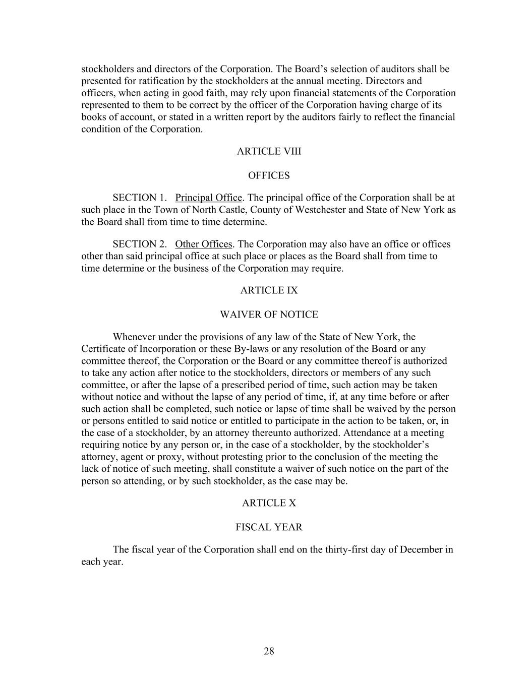 28名股东和公司董事。董事会选定的审计机构应在年度会议上提交股东批准。董事及高级人员在诚信行事时,可依赖由掌管其账簿的公司高级人员向他们所代表的公司财务报表是正确的,或在核数师的书面报告中公平地说明,以反映公司的财务状况。第八条办公室第一节。主要办公室。公司的主要办事处应设在董事会不时确定的位于北堡镇、威彻斯特郡和纽约州的地点。第2节。其他办事处。公司亦可在委员会不时决定或公司业务所需的一个或多于一个地方设有一间或多于一间并非上述主要办事处的办事处。第九条豁免通知每当根据纽约州任何法律、公司注册证书或本附例或董事会或其任何委员会的任何决议,授权公司或董事会或其任何委员会在向任何该等委员会的股东、董事或成员发出通知后采取任何行动,或在规定期限后,可不经通知而在任何期限内采取该等行动,如果,在该行动完成之前或之后的任何时间,该通知或时间流逝应由有权获得该通知或有权参与将采取的行动的人放弃,或在股东的情况下,由获授权的律师放弃。出席须由任何人发出通知的会议,或如属股东,则由股东的代理人、代理人或代理人出席,而无须在会议结束前抗议没有发出该会议的通知,即构成如此出席的人或该股东(视属何情况而定)对该通知的放弃。第十条财政年度公司的会计年度在每年的十二月三十一日结束。
