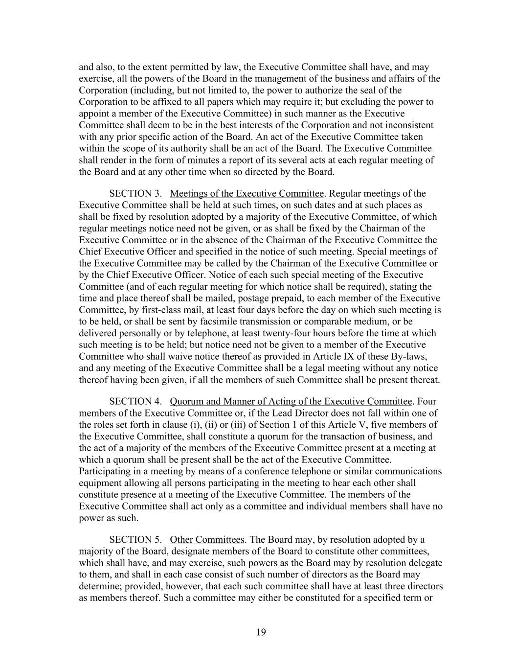 19以及在法律许可的范围内,执行委员会拥有并可行使董事会在管理公司业务和事务方面的所有权力(包括但不限于授权在可能需要其的所有文件上加盖公司印章的权力;但不包括委任执行委员会成员的权力),其方式为执行委员会认为符合公司的最佳利益,且不与董事会先前的任何具体行动相抵触。执行委员会在其权限范围内采取的行为,即为董事会行为。执行委员会应在董事会的每次定期会议上以及在董事会如此指示的任何其他时间,以会议记录的形式提出关于其若干行为的报告。第3节。执行委员会会议。执行委员会定期会议应在执行委员会过半数通过的决议确定的时间、日期和地点举行,其中不必发出定期会议通知,或由执行委员会主席确定,或在执行委员会主席缺席时由首席执行官确定,并在该会议通知中指明。执行委员会的特别会议可由执行委员会主席或首席执行官召集。执行委员会每次此类特别会议的通知(以及须发出通知的每次定期会议的通知),述明会议的时间和地点,应至少在举行此类会议之日前四天以一等邮件方式邮寄给执行委员会的每一位成员,并预付邮资,或以传真或类似媒介发送,或亲自送达或电话送达,在举行该会议的时间前至少二十四小时;但无须按本附例第九条的规定向须放弃有关通知的执行委员会成员发出通知,而执行委员会的任何会议均为法律会议,而无须发出任何有关通知,但该委员会的所有成员均须出席。第4节。执行委员会的法定人数和行事方式。执行委员会的四名成员,或如果首席董事不属于本条第五条第1节第(i)、(ii)或(iii)款规定的角色之一,则执行委员会的五名成员应构成业务交易的法定人数,出席应达到法定人数的会议的执行委员会过半数成员的行为应为执行委员会的行为。使用会议电话或类似通信设备参加会议,使参加会议的所有人能够相互听取意见,即构成出席执行委员会会议。执行委员会的成员只能作为一个委员会行事,个别成员本身没有权力。第5节。其他委员会。董事会可藉经董事会过半数通过的决议,指定董事会成员组成其他委员会,这些委员会拥有并可行使董事会藉决议转授给他们的权力,并在每宗个案中由董事会决定的董事人数组成;但每个该等委员会须至少有三名董事为其成员。这样的委员会可以组成一个特定的任期,也可以