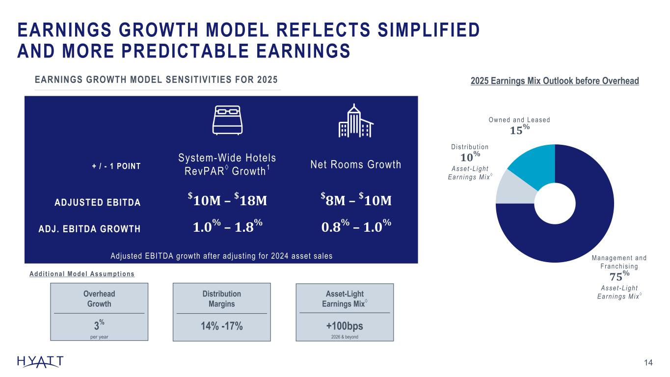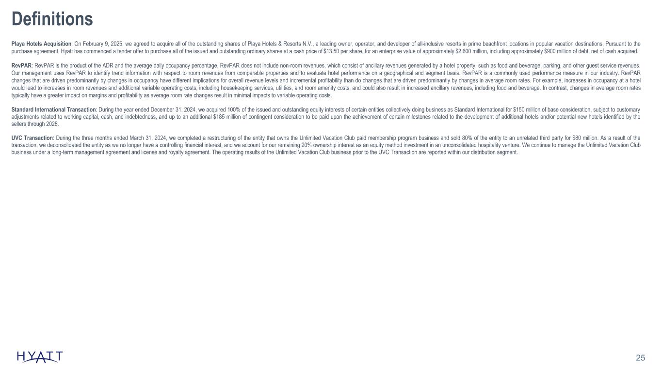 25定义Playa Hotels Acquisition:于2025年2月9日,我们同意收购Playa Hotels & Resorts N.V.的所有流通股,该公司是一家领先的所有者、运营商和开发商,在热门度假目的地的黄金海滨位置提供全包度假村。根据购买协议,凯悦已开始要约收购所有已发行和流通在外的普通股,现金价格为每股13.50美元,企业价值约为26亿美元,其中包括约9亿美元的债务,扣除收购的现金。RevPAR:RevPAR是ADR和日均入住率的乘积。RevPAR不包括非客房收入,非客房收入包括酒店物业产生的辅助收入,如餐饮、停车和其他宾客服务收入。我们的管理层使用RevPAR来识别与可比物业的客房收入相关的趋势信息,并在地理和细分基础上评估酒店业绩。RevPAR是我们行业常用的绩效衡量指标。主要由入住率变化驱动的RevPAR变化与主要由平均房价变化驱动的变化相比,对整体收入水平和增量盈利能力的影响不同。例如,酒店入住率的增加将导致客房收入的增加和额外的可变运营成本,包括家政服务、公用事业和房间便利设施成本,还可能导致包括食品和饮料在内的辅助收入增加。相比之下,平均房价的变化通常会对利润率和盈利能力产生更大的影响,因为平均房价变化对可变运营成本的影响最小。标准国际交易:在截至2024年12月31日的一年中,我们以1.5亿美元的基本对价收购了作为标准国际集体开展业务的某些实体的100%已发行和未偿还股权,但须遵守与营运资金、现金和债务相关的惯常调整,以及在实现与卖方确定的到2028年开发更多酒店和/或潜在新酒店相关的某些里程碑时将支付的最多1.85亿美元的或有对价。UVC交易:在截至2024年3月31日的三个月内,我们完成了对拥有Unlimited Vacation Club付费会员计划业务的实体的重组,并以8000万美元的价格将该实体80%的股份出售给了非关联第三方。作为交易的结果,我们取消了该实体的合并,因为我们不再拥有控股财务权益,我们将剩余的20%所有权权益作为权益法投资计入一家未合并的酒店企业。我们继续根据长期管理协议以及许可和特许权使用费协议管理无限度假俱乐部业务。UVC交易前无限度假俱乐部业务的经营业绩在我们的分销分部内报告。
