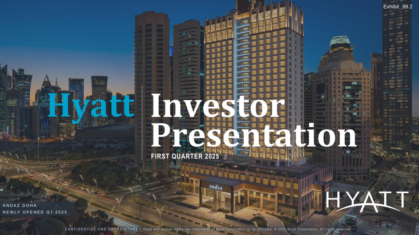 21参考幻灯片3:投资考虑1提出的指标和与较大竞争对手的增长率比较截至2024年12月31日。2通过股份回购和分红回报股东。2017年1月1日至2024年12月31日统计的数字。幻灯片4:跨多个维度的战略增长1基于截至2017年12月31日和2024年12月31日的年度计算的增长比较。2如我们在2018年10-K表中所披露,2017年的毛费收入代表在截至2018年12月31日止年度内采用ASC 606后的管理、特许经营和其他费用。幻灯片5:HYATT的投资组合具有独特的定位;受截至2024年12月31日的豪华、度假村和生活方式酒店数据大幅扩张的推动(除非另有说明)。Smith Travel Research连锁规模分类定义的豪华和度假客房。1基于截至2017年12月31日止年度的数字和增长指标,反映了公司何时宣布其永久拥有的资产出售承诺。2包括Alila、Andaz、Bunkhouse Hotels、Dream Hotels、Hyatt Centric、JDV by Hyatt、Me and All Hotels、The Standard、the StandardX、The Unbound Collection by Hyatt和Thompson Hotels。3资料来源:Smith Travel Research Global Census,截至2024年12月31日。幻灯片6:全球酒店公司专注于服务截至2025年3月31日的高端旅行者数字。1全球品牌包括2025年3月31日品牌酒吧、巴伊亚普林西比酒店及度假村、凯悦精选。2资料来源:Smith Travel Research Global Census,截至2025年3月31日。Smith Travel Research连锁规模分类定义的豪华品牌客房。幻灯片7:重新定义截至2025年3月31日的LOYALTY World of Hyatt会员资格,增长率代表与截至2024年3月31日和2025年3月31日的季度的同比比较。根据截至2024年12月31日的公开文件计算的每家酒店1名会员的数字。22023 J.D. Power 2023美国旅游APP和旅游网站满意度。幻灯片8:截至2025年3月31日的品牌组合1反映了焦点和差异1品牌组合。幻灯片10:2025年第一季度重点1截至2025年3月31日的数字,增长率代表与截至2024年3月31日和2025年3月31日的季度的同比比较。幻灯片11:2025年全年展望1在截至2024年12月31日的年度内,公司修订了调整后EBITDA的定义,以排除交易和整合成本,并重铸前期业绩以提供可比性。有关更多详细信息,请参阅2025年第一季度收益发布中的时间表A-6。2反映到2024年自有和租赁部门调整后EBITDA减少8000万美元,以计入已售酒店的影响。请参阅2025年第一季度收益发布中的附表A-9,了解有关出售资产对自有和租赁部门调整后EBITDA ↓的调整的更多详细信息。该公司2025年展望的全部细节可在其2025年第一季度收益发布中找到。该公司的2025年展望基于一些可能发生变化的假设,其中许多假设超出了公司的控制范围。如果实际结果与这些假设不同,公司的预期可能会发生变化。不能保证公司将取得这些成果。2025年展望中未包括截至本报告之日已完成的任何处置或收购活动。我们的2025年展望没有考虑到计划中的Playa Hotels收购,但是,我们调整后的自由现金流不包括与Playa Hotels收购相关的某些成本。