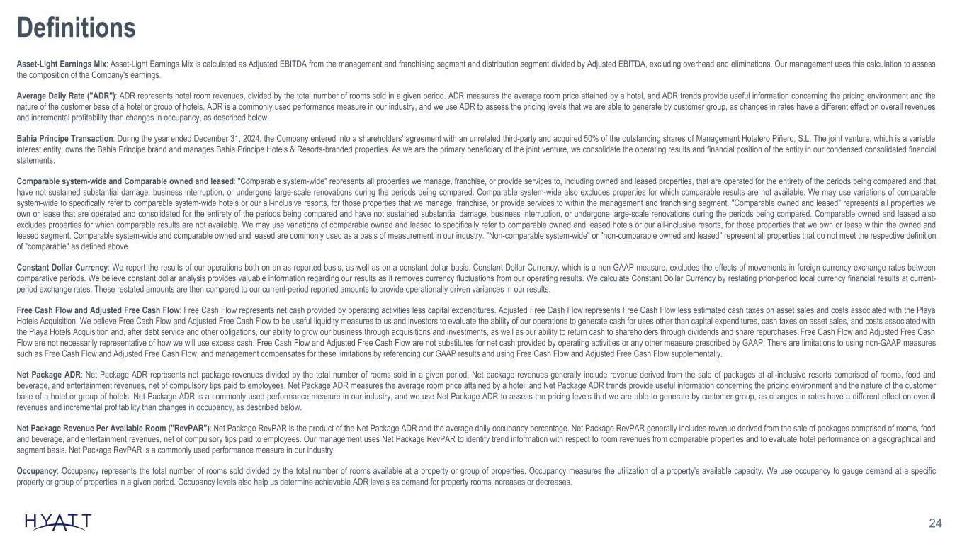 24定义轻资产收益组合:轻资产收益组合的计算方法是管理和特许经营部门和分销部门的调整后EBITDA除以调整后EBITDA,不包括间接费用和冲销。我们的管理层使用这一计算来评估公司收益的构成。平均每日房价(ADR):ADR表示酒店客房收入,除以特定时期内售出的客房总数。ADR衡量的是一家酒店获得的平均房价,ADR趋势提供了有关一家酒店或一组酒店的定价环境和客户群性质的有用信息。ADR是我们行业常用的绩效衡量指标,我们使用ADR来评估我们能够按客户群体产生的定价水平,因为费率变化对整体收入和增量盈利能力的影响不同于入住率变化,如下所述。Bahia Principe交易:截至2024年12月31日止年度,公司与非关联第三方订立股东协议,收购Management Hotelero Pi ñ ero,S.L. 50%的已发行股份。这家合资企业是一个可变利益实体,拥有巴伊亚普林西比品牌并管理巴伊亚普林西比酒店及度假村品牌物业。由于我们是合资企业的主要受益者,我们在简明综合财务报表中合并了该实体的经营业绩和财务状况。可比全系统及可比自有和租赁:“可比全系统”指我们管理、特许经营或向其提供服务的所有物业,包括自有和租赁物业,在整个被比较期间运营,并且在被比较期间没有遭受实质性损坏、业务中断或进行大规模翻修。全系统可比也不包括无法获得可比结果的物业。对于我们在管理和特许经营部门内管理、特许经营或提供服务的那些物业,我们可能会使用可比的全系统酒店的变体来具体提及可比的全系统酒店或我们的全包度假村。“可比拥有和租赁”指我们拥有或租赁的所有在整个被比较期间运营和合并的物业,并且在被比较期间没有遭受实质性损坏、业务中断或进行大规模翻新。可比自有和租赁也不包括无法获得可比结果的物业。对于我们在自有和租赁分部内拥有或租赁的那些物业,我们可能会使用可比的自有和租赁的变体来具体提及可比的自有和租赁酒店或我们的全包度假村。可比的全系统和可比的自有和租赁在我们的行业中被普遍用作衡量的基础。“不可比较的全系统”或“不可比较的自有和租赁”是指不符合上述“可比较”各自定义的所有财产。恒定美元货币:我们报告我们的运营结果既是按报告的基础,也是按恒定美元的基础。不变美元货币是一种非公认会计原则的衡量标准,不包括比较期间之间外币汇率变动的影响。我们认为,持续的美元分析提供了有关我们业绩的宝贵信息,因为它从我们的经营业绩中消除了货币波动。我们通过以当期汇率重述前期当地货币财务结果来计算固定美元货币。然后将这些重述金额与我们当期报告的金额进行比较,以在我们的结果中提供运营驱动的差异。自由现金流和调整后自由现金流:自由现金流是指经营活动提供的净现金减去资本支出。调整后的自由现金流是指自由现金流减资产出售的估计现金税以及与Playa Hotels收购相关的成本。我们认为,自由现金流和调整后的自由现金流是对我们和投资者有用的流动性衡量标准,用于评估我们的运营为资本支出、资产出售的现金税以及与Playa Hotels收购相关的成本以外的用途产生现金的能力,以及在偿债和其他义务之后,我们通过收购和投资来发展业务的能力, 以及我们通过股息和股票回购向股东返还现金的能力。自由现金流和调整后的自由现金流不一定代表我们将如何使用多余的现金。自由现金流和调整后的自由现金流不能替代经营活动提供的净现金或GAAP规定的任何其他衡量标准。使用自由现金流和调整后自由现金流等非GAAP衡量标准存在局限性,管理层通过参考我们的GAAP结果并补充使用自由现金流和调整后自由现金流来弥补这些局限性。Net package ADR:Net package ADR表示净包收入除以在特定时期内售出的房间总数。套餐净收入一般包括在包括客房、食品和饮料在内的全包式度假村销售套餐所得的收入,以及娱乐收入,扣除支付给员工的强制性小费。Net Package ADR衡量的是一家酒店获得的平均房价,Net Package ADR趋势提供了有关酒店或酒店集团的定价环境和客户群性质的有用信息。Net Package ADR是我们行业中常用的性能衡量标准,我们使用Net Package ADR来评估我们能够按客户群体产生的定价水平,因为费率变化对整体收入和增量盈利能力的影响不同于入住率变化,如下所述。每间可用客房的净套餐收入(“RevPAR”):净套餐RevPAR是净套餐ADR和日均入住率的乘积。Net package RevPAR通常包括销售由客房、食品和饮料以及娱乐收入组成的套餐所产生的收入,扣除支付给员工的强制性小费。我们的管理层使用净套餐RevPAR来识别与可比物业的客房收入相关的趋势信息,并在地理和细分基础上评估酒店业绩。净包RevPAR是我们行业常用的绩效衡量指标。入住率:入住率是指已售房间总数除以某一物业或一组物业的可用房间总数。入住率衡量物业可用容量的利用率。我们使用入住率来衡量特定物业或一组物业在特定时期的需求。随着对物业房间的需求增加或减少,入住率水平也有助于我们确定可实现的ADR水平。