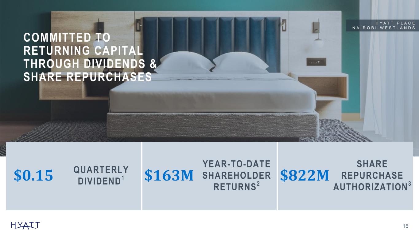 承诺通过股息和股票回购返还资本15 H Y A T T P L A C E N A I R O B I W E S T L A N D S来源说明:脚注:1第二季度股息将于2025年6月11日支付给截至2025年5月29日在册的股东。2包括截至2025年3月31日止三个月的股息及股份回购。3截至2025年3月31日的剩余股份回购授权。股份回购可不时在公开市场、私下协商交易或以其他方式进行,包括根据规则10b5-1计划或加速股份回购交易,价格为公司认为适当,并受市场条件、适用法律和公司全权酌情认为相关的其他因素的约束。普通股回购计划适用于公司的A类普通股和/或公司的B类普通股。普通股回购计划不要求公司回购任何金额或数量的普通股,该计划可能随时暂停或终止。该公司的2025年展望基于一些可能发生变化的假设,其中许多假设超出了公司的控制范围。如果实际结果与这些假设不同,公司的预期可能会发生变化。无法保证公司将取得这些成果。2025年展望中未包括截至本报告之日已完成的任何处置或收购活动。0.15美元的季度股息1 1.63亿美元的年初至今股东回报2 8.22亿美元的股票回购授权3
