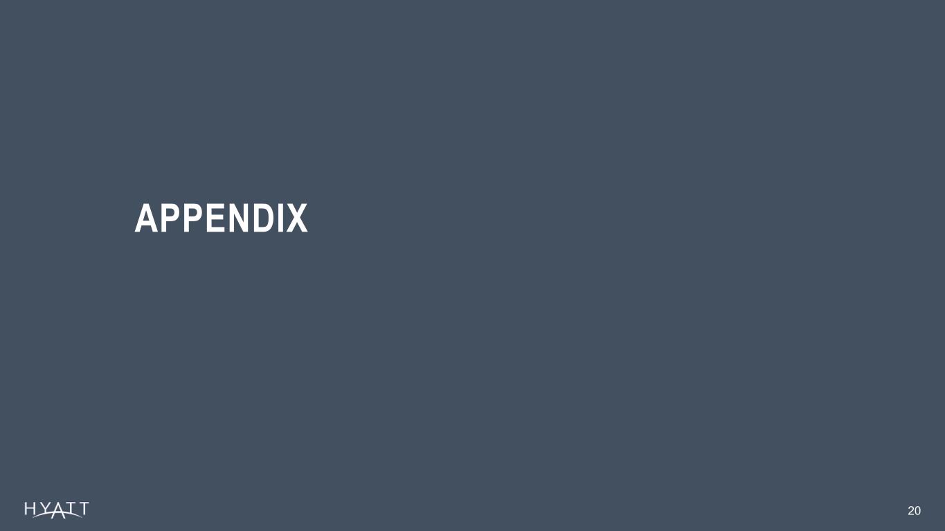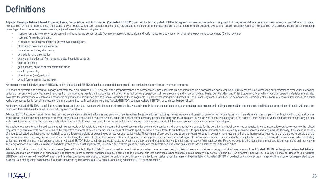 23定义调整后的利息支出、税项、折旧和摊销前利润(“调整后EBITDA”):我们在本次投资者介绍中使用了调整后EBITDA一词。调整后的EBITDA,正如我们所定义的那样,是一种非GAAP衡量标准。我们将合并调整后EBITDA定义为归属于Hyatt Hotels Corporation的净收入(亏损)加上归属于非控股权益的净收入(亏损)以及我们在未合并的自有和租赁酒店企业的调整后EBITDA中按比例分配的份额,主要基于我们在每个自有和租赁企业的所有权百分比,调整后不包括以下项目:•管理和酒店服务协议以及特许经营协议资产(关键资金资产)摊销和业绩补救付款,构成对客户的付款(Contra收入);•已报销成本的收入;•我们打算长期收回的已报销成本;•基于股票的补偿费用;•交易和整合成本;•折旧和摊销;•未合并的酒店企业的股权收益(亏损);•利息支出;•销售房地产和其他收益(亏损);•资产减值;•其他收入(亏损),净额;•所得税的福利(拨备)。我们计算综合调整后EBITDA的方法是将我们每个可报告分部的调整后EBITDA和未分配管理费用的冲销相加。我们的董事会和执行管理团队将调整后的EBITDA作为分部和综合基础上的关键业绩和薪酬衡量标准之一。调整后的EBITDA有助于我们在一致的基础上比较我们在不同报告期间的业绩,因为它从我们的经营业绩中剔除了不反映我们在分部和综合基础上的核心业务的项目的影响。我们的总裁兼首席执行官是我们的首席运营决策者,他还评估我们每个可报告分部的业绩,并部分通过评估每个分部的调整后EBITDA来确定如何将资源分配给这些分部。此外,我们董事会的薪酬委员会部分基于合并调整后EBITDA、分部调整后EBITDA或两者的某种组合来确定我们管理层某些成员的年度可变薪酬。我们认为调整后的EBITDA对投资者有用,因为它为投资者提供了我们内部用于评估我们的经营业绩和做出薪酬决定的相同信息,并有助于我们将结果与我们的前期和预测结果以及我们的行业和竞争对手进行比较。调整后的EBITDA不包括在不同行业和同一行业内的公司之间可能有很大差异的某些项目,包括利息费用和福利或所得税准备金,这取决于公司的具体情况,包括资本结构、信用评级、税收政策和它们经营所在的司法管辖区;折旧和摊销,这取决于公司政策,包括资产的使用方式以及分配给资产的寿命;Contra收入,这取决于公司政策和有关向酒店所有者付款的战略决策;以及基于股票的补偿费用,由于公司采取了不同的补偿计划,这在公司之间有所不同。我们不包括与工资成本报销相关的已报销成本和已报销成本以及我们为酒店业主的利益运营的全系统服务和计划的收入,因为根据合同我们不提供服务或运营相关计划以在各自合同条款内产生利润。如果我们收取的金额超过了所花费的金额,我们将向酒店业主承诺将这些金额用于相关的全系统服务和计划。此外,如果我们的支出超过了已收取的金额,我们有合同权利调整未来的收款或支出,以收回前期成本。这些时间差异是由于我们酌情决定在单一时期内支出超过已赚取的收入或低于已赚取的收入,以确保全系统服务和项目的运营符合酒店业主的最佳长期利益。从长期来看,这些项目和服务并非旨在对我们的经济产生积极或消极的影响。因此,我们在评估经营业绩的同期变化时排除了净影响。调整后的EBITDA包括与全系统服务和项目相关的已报销成本,我们不打算从酒店业主那里收回。最后,我们排除了对我们的运营来说不是核心的、可能在频率或幅度上有所不同的其他项目,例如交易和整合成本、资产减值、 有价证券未实现及已实现损益、出售房地产损益及其他。调整后的EBITDA不能替代归属于Hyatt Hotels Corporation的净收入(亏损)、净收入(亏损)或GAAP规定的任何其他衡量标准。使用调整后EBITDA等非GAAP衡量标准存在局限性。尽管我们认为调整后EBITDA可以使对我们经营业绩的评估更加一致,因为它删除了不反映我们核心业务的项目,但我们行业的其他公司对调整后EBITDA的定义可能与我们不同。因此,可能很难使用其他公司可能使用的调整后EBITDA或类似名称的非GAAP衡量标准来将这些公司的业绩与我们的业绩进行比较。由于这些限制,调整后的EBITDA不应被视为衡量我们业务产生的收入(亏损)的指标。我们的管理层通过参考我们的GAAP结果并补充使用调整后的EBITDA来弥补这些限制。