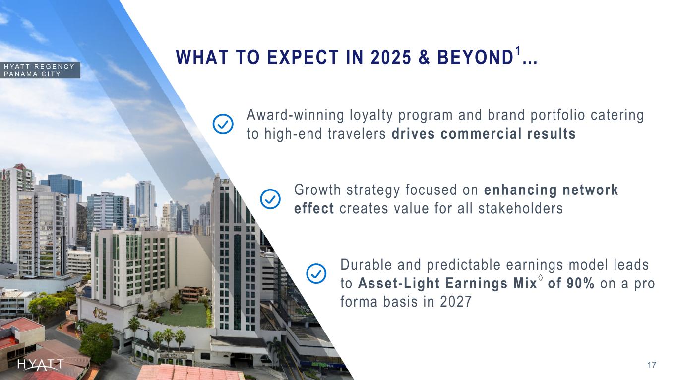 2025年有何期待&超越1…H Y A T R E G E N C Y P A N A M A C I T Y增长战略侧重于增强网络效应为al l利益相关者创造价值持久和可预测的盈利模式导致2027年在备考基础上的轻资产盈利组合为90%屡获殊荣的忠诚度计划和迎合高端旅行者的品牌portfol io推动了商业业绩17脚注:1公司的前景基于多项假设可能发生变化,其中许多不在公司控制范围内。如果实际结果与这些假设不同,公司的预期可能会发生变化。无法保证公司将取得这些成果。