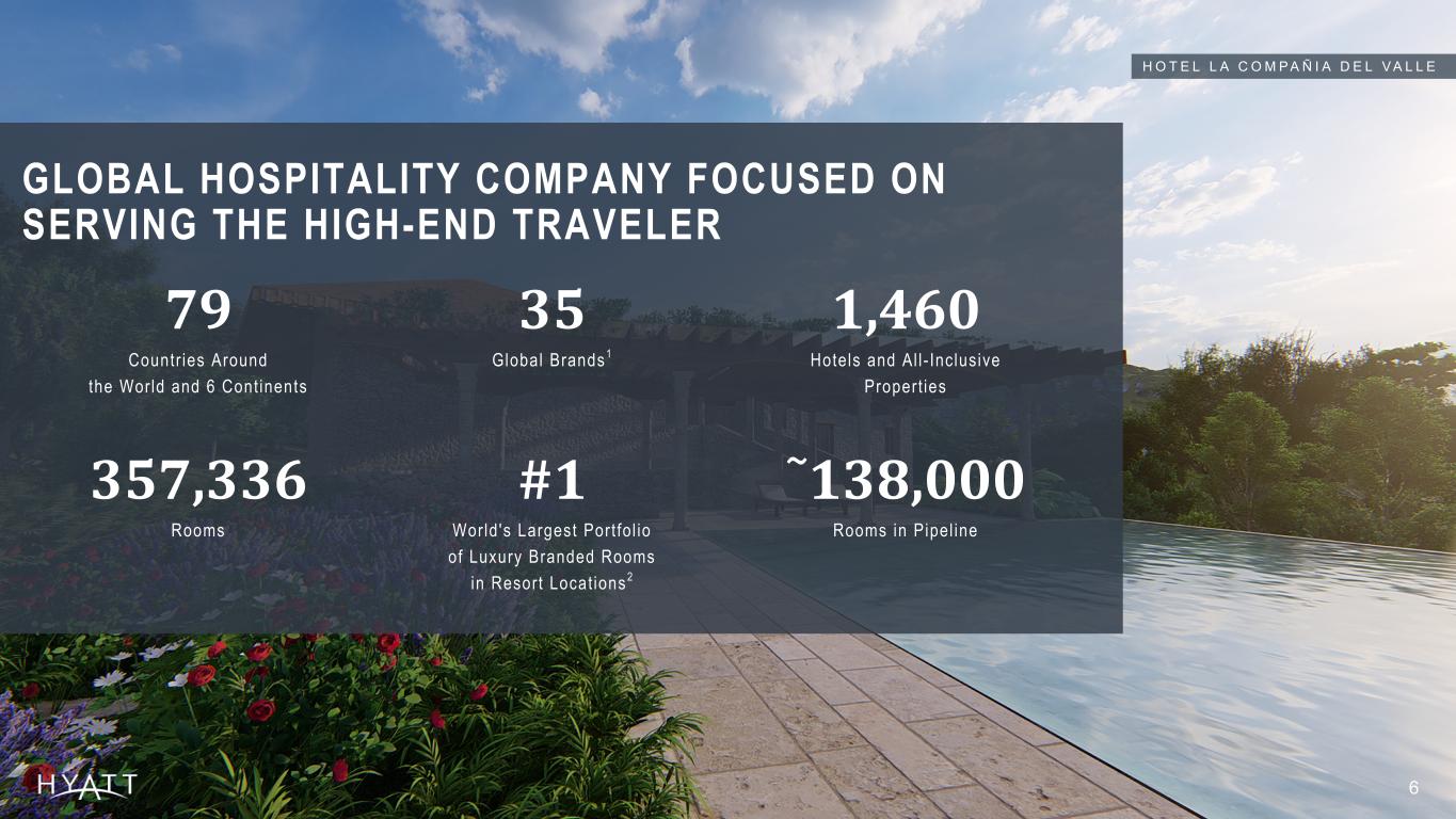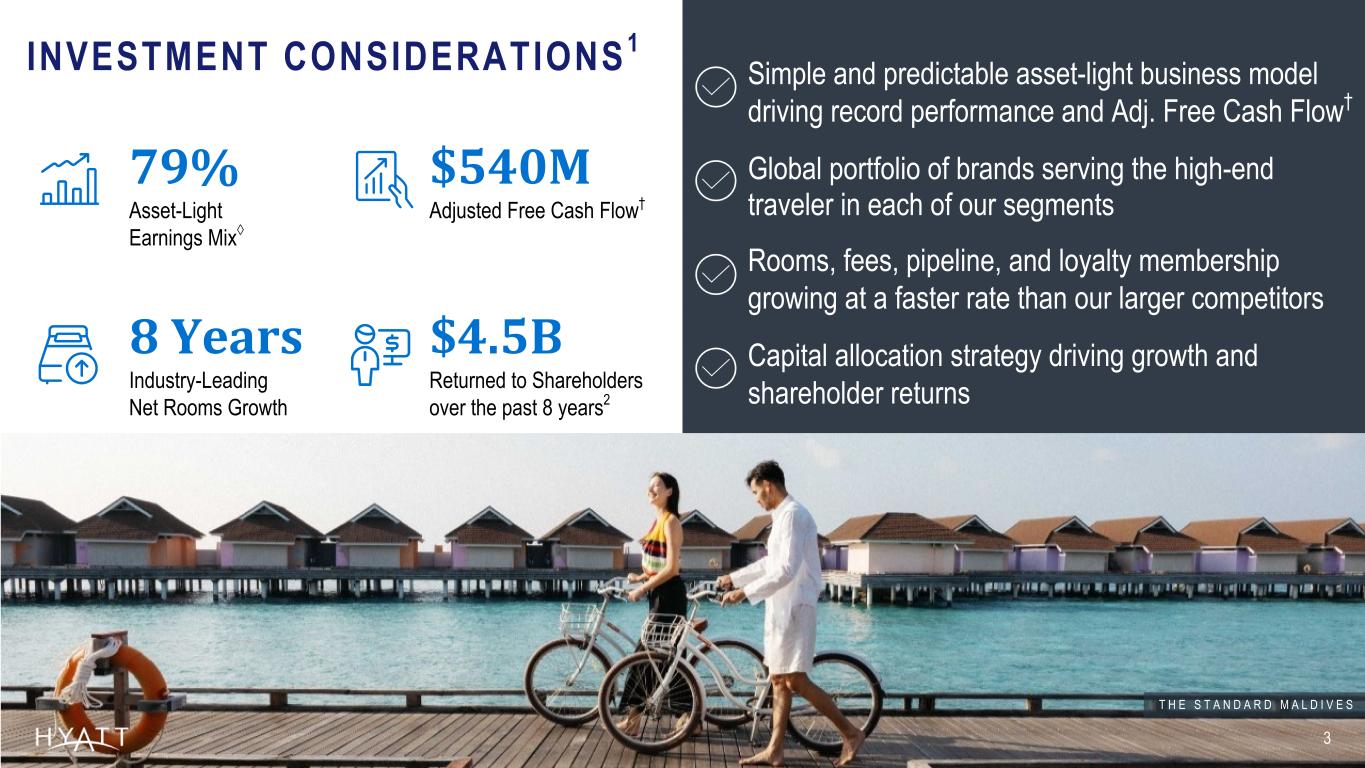 免责声明2前瞻性陈述本演示文稿中的前瞻性陈述不是历史事实,属于1995年《私人证券诉讼改革法案》含义内的前瞻性陈述。这些报表包括关于Hyatt Hotels Corporation(“凯悦”、“公司”、“我们”、“我们”或“我们的”)计划、战略、前景、我们预计未来开业的物业数量、我们的增长模式、我们的信用评级预期、我们的资本分配计划、我们的预期资本支出、我们的预期净收入和调整后EBITDA、我们的预期净客房增长、我们的预期全系统酒店RevPAR增长、我们的预期调整后自由现金流、财务业绩、预期或未来事件以及涉及难以预测的已知和未知风险的报表。因此,我们的实际结果、业绩或成就可能与这些前瞻性陈述明示或暗示的内容存在重大差异。在某些情况下,您可以通过使用诸如“可能”、“可能”、“预期”、“打算”、“计划”、“寻求”、“预期”、“相信”、“估计”、“预测”、“潜在”、“继续”、“可能”、“将”、“将”以及这些术语和类似表达的变体,或这些术语或类似表达的否定等词语来识别前瞻性陈述。此类前瞻性陈述必然基于估计和假设,尽管我们和我们的管理层认为这些估计和假设是合理的,但本质上是不确定的。可能导致实际结果与当前预期存在重大差异的因素包括但不限于:全球主要市场的总体经济不确定性以及全球经济状况恶化或经济增长水平低;经济下滑后经济复苏的速度和步伐;全球供应链限制和中断,与建筑相关的劳动力和材料成本上升,以及由于通货膨胀或其他因素导致的成本增加,这些因素可能无法完全被我们业务收入的增长所抵消;影响豪华、度假村和全包住宿部分的风险;商业支出水平,休闲、团体部分,以及消费者信心;入住率和平均每日房价下降;未来预订的能见度有限;关键人员流失;国内和国际政治和地缘政治状况,包括政治或内乱或贸易政策变化;全球关税政策或法规的影响;敌对行动,或担心敌对行动,包括未来的恐怖袭击,会影响旅行;计划中的Playa Hotels收购的宣布或未决可能对我们、Playa和我们各自的业务以及保留和雇用关键人员以及维持与客户关系的能力产生的影响,供应商和与我们或他们有业务往来的其他人;无法获得所需的监管或政府批准或在令人满意的条件下获得此类批准;无法获得Playa普通股的足够的股东投标、股东批准或满足其他成交条件;任何事件的发生,可能导致最终协议终止的变更或其他情况;最终协议的任何终止可能对我们或我们的业务产生的影响;未能成功完成计划中的收购;可能就计划中的收购提起的法律诉讼;与计划中的收购相关的重大和意外成本、费用或开支;与潜在资产剥离相关的风险,包括Playa房地产或业务以及我们以优惠条件或根本无法完成出售Playa自有房地产的协议的能力;成功将收购与现有业务整合的能力或失败;实现Playa Hotels收购的预期协同效应或获得预期结果的能力;与旅行相关的事故;自然或人为灾害、天气和气候相关事件,例如飓风、地震、海啸、龙卷风、干旱、洪水、野火、石油泄漏、核事故以及全球爆发的流行病或传染病,或担心此类疫情爆发;我们有能力在有业绩测试或保证有利于我们第三方所有者的酒店成功实现特定水平的经营利润;酒店翻新和重建的影响;与我们的资本分配计划、股票回购计划和股息支付相关的风险,包括减少、消除或暂停回购活动或股息支付;房地产和酒店业务的季节性和周期性;分配安排的变化, 比如通过互联网旅游中介;我们客户的口味和偏好的变化;与同事和工会的关系以及劳动法的变化;第三方所有者、特许经营商和酒店风险合作伙伴的财务状况,以及我们与这些第三方所有者、特许经营商的关系;第三方所有者、特许经营商可能无法,或发展合作伙伴获得为当前运营提供资金或实施我们的增长计划所需的资本;与潜在收购和处置相关的风险以及我们将已完成的收购与现有运营成功整合的能力;未能成功完成拟议交易(包括未能满足成交条件或获得所需批准);我们对财务报告和披露控制和程序保持有效内部控制的能力;我们的房地产资产价值下降;我们的管理和酒店服务协议或特许经营协议的意外终止;联邦、州、地方、或外国税法;利率、工资和其他运营成本增加;外汇汇率波动或货币重组;与引入新品牌概念相关的风险,包括缺乏对新品牌或创新的接受;资本市场的普遍波动和我们进入这些市场的能力;我们行业竞争环境的变化,行业整合,以及我们经营所在的市场;我们成功发展凯悦世界忠诚度计划和管理无限度假俱乐部付费会员计划的能力;网络事件和信息技术故障;法律或行政诉讼的结果;违反与我们的特许经营业务和许可业务以及我们的国际业务相关的法规或法律;以及公司向SEC提交的文件中讨论的其他风险,包括我们的10-K表格年度报告和10-Q表格季度报告,哪些文件可从SEC获得。所有可归属于我们或代表我们行事的人的前瞻性陈述都完全受到上述警示性陈述的明确限定。我们提醒您不要过分依赖任何前瞻性陈述,这些陈述仅在本演示文稿发布之日作出。我们不承担或承担任何义务公开更新任何这些前瞻性陈述,以反映实际结果、新信息或未来事件、假设变化或影响前瞻性陈述的其他因素的变化,但适用法律要求的范围除外。如果我们更新一项或多项前瞻性陈述,不应推断我们将对这些或其他前瞻性陈述进
