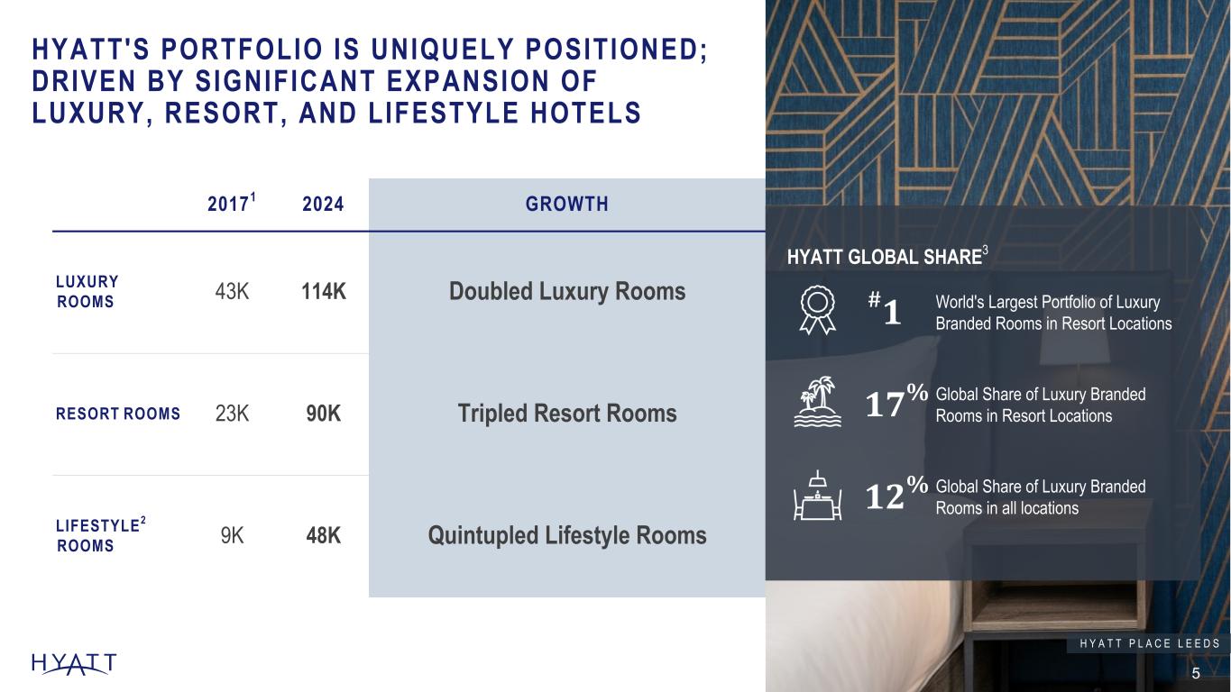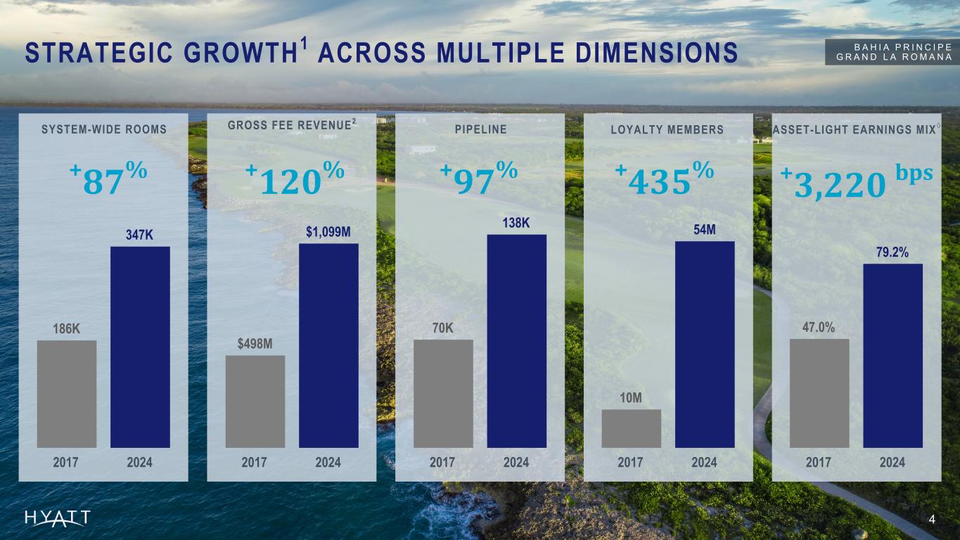 跨多个维度的战略增长1 4 + 87% + 120% + 97% + 435% + 3220bps全系统客房毛费收入2管道忠诚会员资产-轻收益混合⑤来源说明:每年更新,数据符合YE 2024。支持:凯悦酒店 \ CHICO-Team-Corporate FPA-文件\ Fact Pack和QA文件\ 2024 \ Investor Consideration Deck Support \ Annual \ Strategic Growth Support File-2009数据可在2009文件夹全系统房间基于截至2009年12月31日的库存中找到费用收入、管道、忠诚度会员基于凯悦2009年年报-2017数据可在2017文件夹全系统房间基于截至2017年12月31日的库存中找到费用收入和管道基于2017年Q4收益发布忠诚度会员基于10-K 2017-2023数据全系统房间基于截至12月31日的库存中,基于2023年第四季度的2023年费用收入和管道收益发布基于10-K2023的忠诚度会员以及注册和计划会员数量2023年第四季度脚注:1基于截至2017年12月31日和2024年12月31日的年度计算的增长比较。22017年的毛费收入指在我们的2018年10-K表中披露的截至2018年12月31日止年度内采用ASC 606后的管理、特许经营和其他费用。186K 347K 20172024 $ 498M $ 1,099m 20172024 70K 138K 20172024 10m 54m 20172024 47.0% 79.2% 20172024 B A H I A P R I N C I P E G R A N D L A R O M A N A