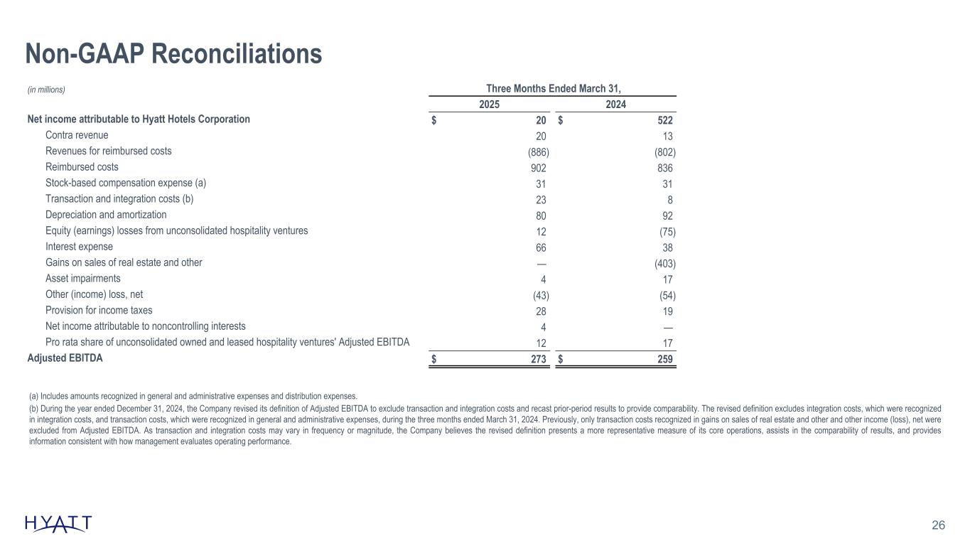 Non-GAAP对账26(百万)截至2025年3月31日的三个月2024年归属于Hyatt Hotels Corporation的净利润20美元522美元相反的收入2013已报销成本的收入(886)(802)已报销成本902836基于股票的补偿费用(a)3131交易和整合成本(b)238折旧和摊销8092来自未合并的酒店企业的权益(收益)损失12(75)利息费用6638出售房地产和其他的收益——(403)资产减值417其他(收入)损失,净额(43)(54)所得税拨备2819非控股权益应占净收入4 —未合并自有和租赁酒店企业调整后EBITDA的按比例份额1217调整后EBITDA 273美元259美元来源说明:与ER附表(a)挂钩,包括一般和行政费用以及分销费用中确认的金额。(b)截至2024年12月31日止年度,公司修订了调整后EBITDA的定义,以排除交易和整合成本,并重铸前期业绩以提供可比性。修订后的定义不包括在截至2024年3月31日的三个月期间在整合成本中确认的整合成本和在一般和行政费用中确认的交易成本。此前,只有在房地产销售收益和其他及其他收入(亏损)中确认的交易成本,净额被排除在调整后EBITDA之外。由于交易和整合成本可能在频率或幅度上有所不同,公司认为修订后的定义提供了更具代表性的核心业务衡量标准,有助于结果的可比性,并提供了与管理层如何评估经营业绩一致的信息。
