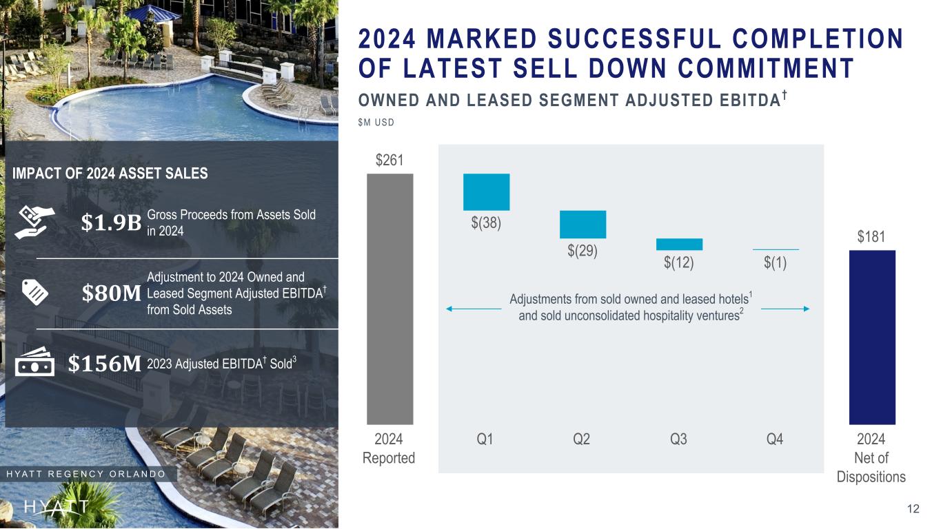2024年标志着成功完成最新的出售承诺12对2024年资产销售的影响$ 1.9b 2024年出售资产的毛收益$ 8000万调整到2024年自有和租赁部门调整后EBITDA †来自出售资产$ 1.56亿2023年调整后EBITDA ↓已售3来源说明:按YE更新,基于已售自有和租赁酒店的ER时间表调整1和已售未合并酒店业务2脚注:有关已售资产调整自有和租赁部门调整后EBITDA †的更多详细信息,请参见2025年第一季度收益发布的附表A-9。1来自已售自有和租赁酒店的调整代表截至2025年3月31日已售出且公司为其订立长期管理或特许经营协议的酒店在每个期间的调整后EBITDA ↓贡献;不包括出售后保留的总费用。已售出的酒店包括阿鲁巴凯悦度假酒店水疗和赌场(1Q24)、苏黎世柏悦酒店(2Q24)、圣安东尼奥河滨步道凯悦酒店(2Q24)、绿湾凯悦酒店(2Q24)、奥兰多凯悦酒店(3Q24)、芝加哥奥黑尔凯悦酒店(4Q24)。2来自已售未合并酒店企业的调整代表凯悦在每个期间对已出售的未合并酒店企业(Cabo Del Sol酒店和住宅的Park Hyatt Los Cabos(24年第四季度)和纳什维尔市中心的Hyatt Centric(24年第四季度))或截至2024年12月31日我们的未合并酒店企业的所有权被稀释的未合并酒店企业的调整后EBITDA ↓贡献的按比例份额。3代表2023和2024年出售的自有和租赁酒店的2023年调整后EBITDA ↓贡献,据此,公司签订了长期管理或特许经营协议,不包括出售后保留的毛费,以及2023和2024年出售的未合并酒店企业的未合并酒店企业的2023年调整后EBITDA ↓贡献的按比例份额。H Y A T R E G E N C Y O R L A N D O自有和租赁部门调整后EBITDA † $ M USD 12 $ 261 $(38)$(29)$(12)$(1)$ 1812024报告的Q1 Q2 Q3 Q4 2024净处置