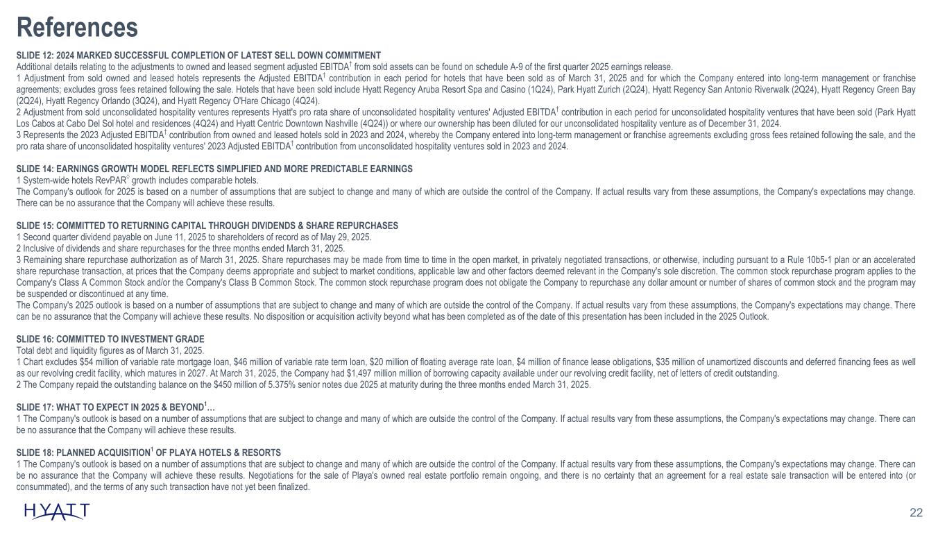 22参考资料幻灯片12:2024年标志着成功完成最新的卖出下调承诺有关出售资产的自有和租赁部门调整后EBITDA †的调整的更多详细信息,可在2025年第一季度收益发布的附表A-9中找到。1已出售的自有和租赁酒店的调整代表截至2025年3月31日已出售且公司为其订立长期管理或特许经营协议的酒店在每个期间的调整后EBITDA ↓贡献;不包括出售后保留的总费用。已售出的酒店包括阿鲁巴凯悦度假酒店水疗和赌场(1Q24)、苏黎世柏悦酒店(2Q24)、圣安东尼奥河滨步道凯悦酒店(2Q24)、绿湾凯悦酒店(2Q24)、奥兰多凯悦酒店(3Q24)、芝加哥奥黑尔凯悦酒店(4Q24)。2来自已售未合并酒店企业的调整代表凯悦在每个期间对已出售的未合并酒店企业(Cabo Del Sol酒店和住宅的Park Hyatt Los Cabos(24年第四季度)和纳什维尔市中心凯悦酒店(24年第四季度))或截至2024年12月31日我们的未合并酒店企业的所有权已被稀释的未合并酒店企业的调整后EBITDA ↓贡献的按比例份额。3代表2023和2024年出售的自有和租赁酒店的2023年调整后EBITDA ↓贡献,据此,公司签订了长期管理或特许经营协议,不包括出售后保留的毛费,以及2023和2024年出售的未合并酒店企业的未合并酒店企业的2023年调整后EBITDA ↓贡献的按比例份额。幻灯片14:收入增长模型反映了简化和更可预测的收入1全系统酒店RevPAR ⑤增长包括可比酒店。公司对2025年的展望基于多项假设,这些假设可能会发生变化,其中许多假设超出了公司的控制范围。如果实际结果与这些假设不同,公司的预期可能会发生变化。无法保证公司将取得这些成果。幻灯片15:承诺通过股息和股票回购返还资本1第二季度股息将于2025年6月11日支付给截至2025年5月29日在册的股东。2包括截至2025年3月31日止三个月的股息及股份回购。3截至2025年3月31日的剩余股份回购授权。股份回购可不时在公开市场、私下协商交易或以其他方式进行,包括根据规则10b5-1计划或加速股份回购交易,价格由公司认为适当,并受市场条件、适用法律和公司全权酌情认为相关的其他因素的限制。普通股回购计划适用于公司的A类普通股和/或公司的B类普通股。普通股回购计划不要求公司有义务回购任何金额或数量的普通股,该计划可能随时暂停或终止。公司的2025年展望基于多项可能发生变化的假设,其中许多假设超出了公司的控制范围。如果实际结果与这些假设不同,公司的预期可能会发生变化。无法保证公司将取得这些成果。截至本报告之日已完成的任何处置或收购活动均未列入2025年展望。幻灯片16:承诺的投资等级截至2025年3月31日的总债务和流动性数字。1图表不包括5400万美元的浮动利率抵押贷款、4600万美元的浮动利率定期贷款、2000万美元的浮动平均利率贷款、400万美元的融资租赁义务、3500万美元的未摊销折扣和递延融资费用以及我们的循环信贷额度,这些贷款将于2027年到期。截至2025年3月31日,公司在我们的循环信贷额度下有14.97亿美元的可用借款能力,扣除未偿信用证。2公司在截至2025年3月31日的三个月内偿还了2025年到期的4.5亿美元5.375%优先票据的未偿余额。幻灯片17:2025年的预期& beyond 1…1公司的前景是基于一些可能会发生变化的假设,其中许多是公司无法控制的。如果实际结果与这些假设不同,公司的预期可能会发生变化。无法保证公司将取得这些成果。幻灯片18:计划收购PLAYA HOTELS & RESORTS 1公司的前景基于多项假设,这些假设可能会发生变化,其中许多不在公司的控制范围内。如果实际结果与这些假设不同, 公司的预期可能会改变。无法保证公司将取得这些成果。出售Playa自有房地产投资组合的谈判仍在进行中,并且无法确定将就房地产销售交易达成(或完成)协议,任何此类交易的条款尚未最终确定。