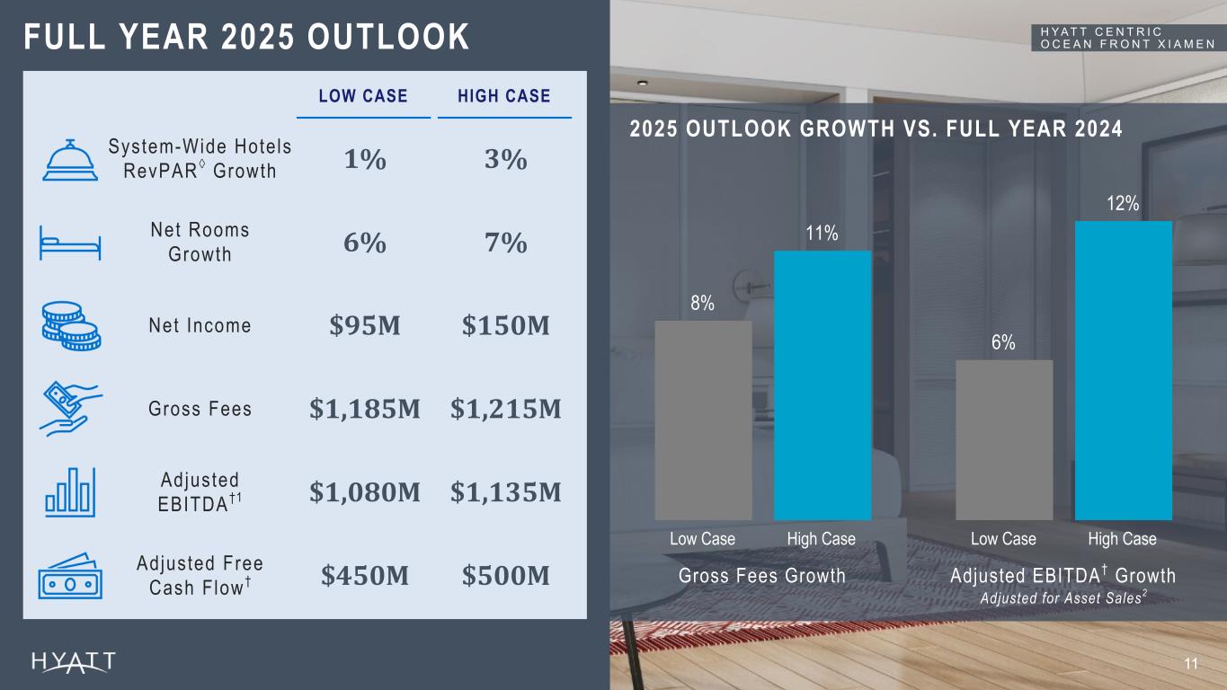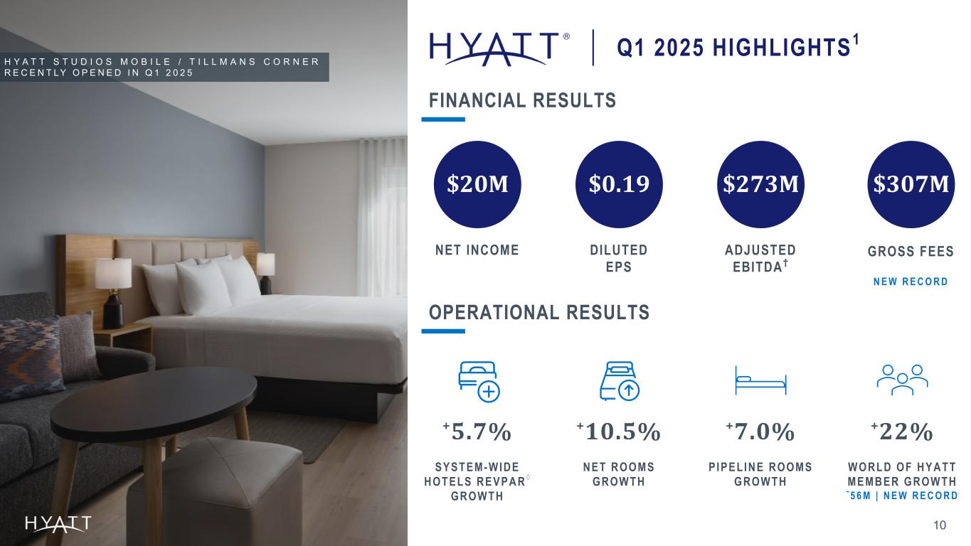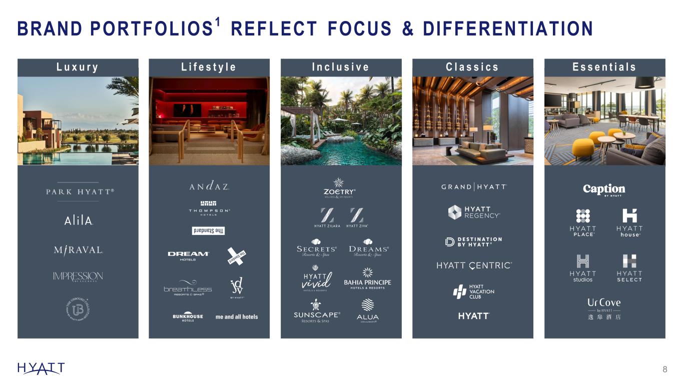 调整后EBITDA ↓稀释每股收益毛费N E W R E C O R D 2000万美元净收入0.19美元2.73亿美元3.07亿美元经营业绩财务业绩+ 7.0% PIPEL INE Rooms增长+ 10.5%净房间增长+ 5.7%全系统酒店REVPAR ⑤增长+ 22% HYATT Member World growth~56 m | N E W R E C O R D Source Notes:Operational Results:RevPAR和NRG与ER挂钩。管道增加量应与上一年的ER(四舍五入管道)vs本年度四舍五入管道#进行计算。凯悦天地会员增长:团队\凯悦酒店 \CHICO-Team-企业丨FPA丨-文件\酒店FP & A \凯悦天地注册报告管道:– 2023年度:127k – 2024年度:138k – 2024第一季度:129k 102025年第一季度亮点1 •超过了2021年8月宣布的资产出售承诺,在承诺期限内以13.3倍的倍数实现了26亿美元的资产出售净收益毛额1 •收购了Standard International,包括标志性的Standard和Bunkhouse Hotels品牌,在2024年期间为凯悦的投资组合增加了25家开业酒店,拥有约2,500间客房•进入长期,与Grupo Pi ñ ero建立轻资产战略合资企业,为凯悦集团的投资组合增加22个巴伊亚普林西比品牌的全包度假村,拥有约12,000间客房•与拉斯维加斯威尼斯人度假村签订长期许可协议,通过凯悦预订渠道提供威尼斯人度假村和威尼斯人度假村宫殿的约7,000间豪华客房HIGHLIGHTS Footnotes:1个数字截至2025年3月31日,增长率代表截至2024年3月31日和2025年3月31日季度的同比比较。H Y A T S T U D I O S M O B I L E/T I L M A N S C O R N E R E C E N T L Y O P E N E D I N Q 12025