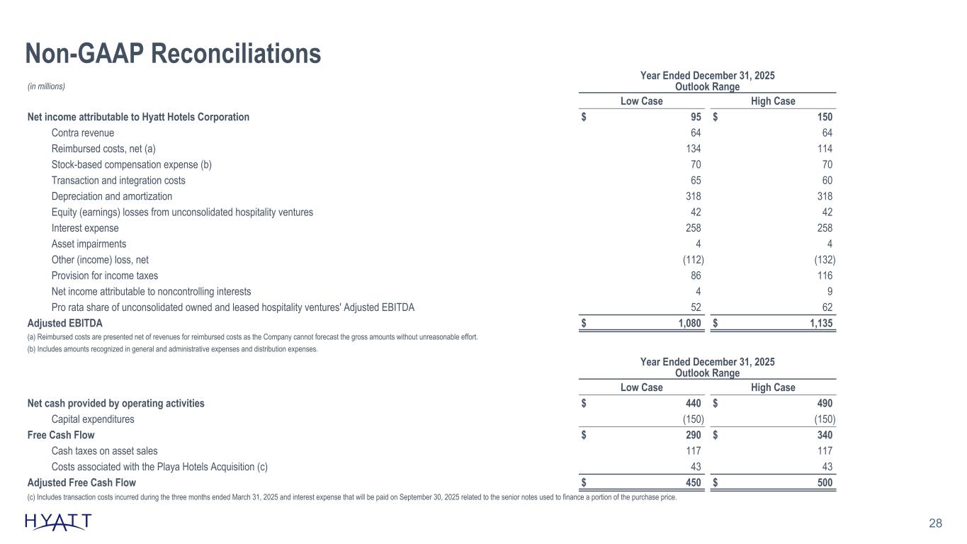 非公认会计原则和解28来源说明:与ER时间表挂钩(百万)截至2025年12月31日的年度展望范围低情况下高情况下归属于Hyatt Hotels Corporation的净利润95美元150美元相反收入6464偿还成本,净额(a)134114基于股票的补偿费用(b)7070交易和整合成本6560折旧和摊销318318未合并的酒店企业的股权(收益)损失4242利息费用258258资产减值44其他(收益)损失,净额(112)(132)所得税拨备86116非控股权益应占净收入49按比例分享未合并的自有和租赁酒店企业的调整后EBITDA 5262调整后EBITDA 1,080美元1,135美元(a)报销成本在扣除已报销成本的收入后列报,因为公司无法在不做出不合理努力的情况下预测毛额。(b)包括在一般和行政费用以及分配费用中确认的数额。截至2025年12月31日止年度展望范围低情况高情况经营活动提供的净现金440美元490美元资本支出(150)(150)自由现金流290美元340美元资产出售现金税117117与Playa Hotels收购相关的成本(c)4343调整后自由现金流450美元500美元(c)包括截至2025年3月31日止三个月期间发生的交易成本以及将于2025年9月30日支付的与用于为部分购买价格提供资金的优先票据相关的利息费用。
