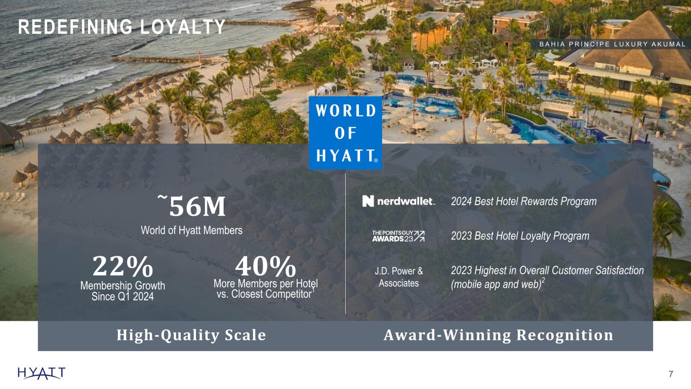 6 GLOBAL HOSPITALITY COMPANY Focused on serving the high-end traveler 79 Countr ies around the world and 6 cont inents 357,336 rooms 35 Global Brands1,460 hotels and Al l-inclusive property ies # 1 the world's largest port fo l io of luxury brand rooms in Resort Locat ions 2~138,000 rooms in Pipel ine Source Notes:Slide Updated Quarterly Countries,Rooms,Hotel Count,and Pipeline linked to ER Body and Consolidations Workbook。根据样板和度假村位置豪华品牌客房排名,手动更新全球品牌。-根据STR普查截至X,2024年12/31/24的同事,度假村地点的豪华品牌客房:227,000个脚注:截至2025年3月31日的数据。1全球品牌包括2025年3月31日品牌酒吧、巴伊亚普林西比酒店及度假村、凯悦精选。2资料来源:Smith Travel Research Global Census,截至2025年3月31日。Smith Travel Research连锁规模分类定义的豪华品牌客房。H O T E L A C O M P A ñ i A D E L V A L E