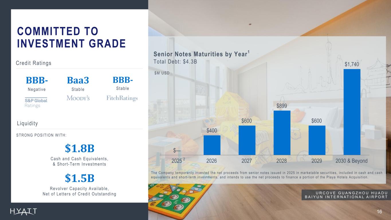致力于投资16级信用评级BBB-Negat ive BBB-Stab le Baa3 Stab le Liquidi ty $ 1.8B Cash and Cash Equ iva len ts,& Shor t-Term Inves $ 1.5b revo lver capac i ty ava i lab le,Net o f le t te rs o f cred i t outs tand ing strong posit ion with:U R C O V E G U A N G Z H O U H U A D U B A I Y U N I N T E R N A T I O N A L A I R P O R T $ — $ 400 $ 600 $ 899 $ 600 $ 1,740202520262027202820292030 & Beyond Source Notes:Footnotes:截至2025年3月31日的总债务和流动性数据。1图表不包括5400万美元的浮动利率抵押贷款、4600万美元的浮动利率定期贷款、2000万美元的浮动平均利率贷款、400万美元的融资租赁义务、3500万美元的未摊销折扣和递延融资费用以及我们的循环信贷额度,这些贷款将于2027年到期。截至2025年3月31日,公司在我们的循环信贷额度下有14.97亿美元的可用借款能力,扣除未偿信用证。2公司在截至2025年3月31日的三个月内偿还了2025年到期的4.5亿美元5.375%优先票据的未偿余额。按年到期的优先票据1总债务:$ 4.3B $ M USD The Company temporar i l y inves ted the ne t p roceeds f rom sen io r no tes i ssued in 2025 in marke tab le secur i ties,inc luded in cash and cash equ iva len ts and shor t-te rm inves,in tends to use the ne t p roceeds to f inance a por t ion o f the p laya hote ls acqu is i t ion。2