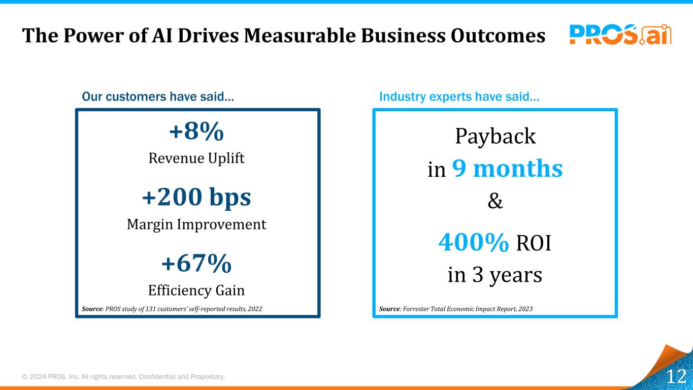 © 2024 PROS,Inc.版权所有。保密和专有。AI的力量推动可衡量的业务成果12400% ROI在3年内9个月内收回&来源:Forrester Total Economic Impact Report,2023 + 8%收入提升+ 200bps利润率改善+ 67%效率增益来源:PROS研究131个客户的自我报告结果,2022我们的客户说…行业专家说…