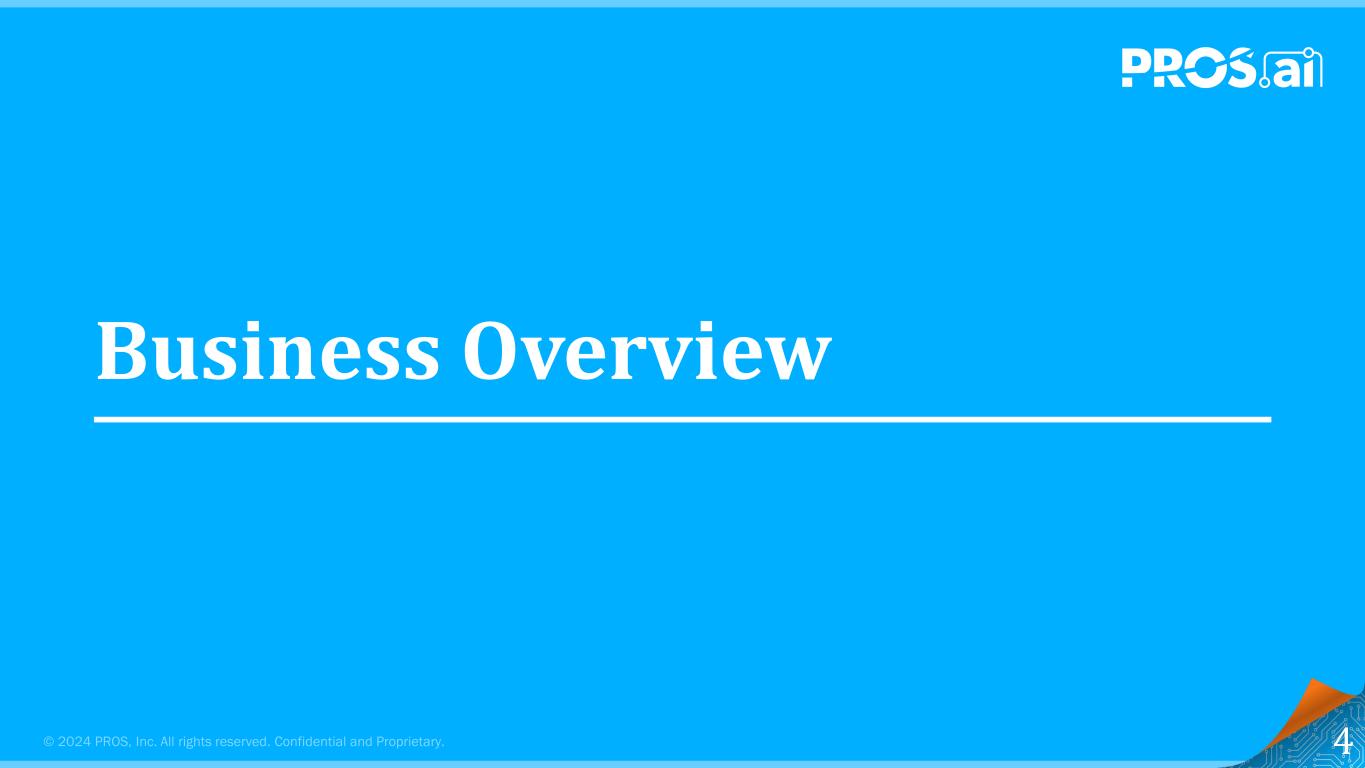 © 2024 PROS,Inc.版权所有。保密和专有。免责声明/前瞻性陈述2本演示文稿包含1995年《私人证券诉讼改革法案》含义内的前瞻性陈述,包括关于我们的财务前景的陈述;预期;实现未来增长和盈利目标的能力;实现“40法则”的能力;管理层的信心和乐观;定位;客户的成功;对我们软件解决方案的需求;管道;业务扩张;收入;订阅收入;订阅ARR;非公认会计准则每股收益(亏损);调整后EBITDA;自由现金流;流通股和有效税率。本演示文稿中包含的前瞻性陈述是基于我们的历史业绩以及我们当前的计划、估计和预期,并不代表这些计划、估计或预期将会实现。可能导致实际结果与此处描述的结果存在重大差异的因素包括(其中包括)与以下相关的风险:(a)我们的产品、系统和基础设施或我们所依赖的第三方产品、系统和基础设施内的网络攻击、数据泄露和安全措施遭到破坏,(b)宏观经济环境和地缘政治不确定性和事件,(c)增加来自客户的业务,维持订阅续订率并获取客户IT支出,(d)有效管理我们的增长和利润目标,(e)来自我们的第三方数据中心、软件、数据和其他不相关服务提供商的中断,(f)实施我们的解决方案,(g)云运营,(h)知识产权和第三方软件,(i)获取和整合业务和/或技术,(j)灾难性事件,(k)全球运营,包括经济和商业中断,ln)潜在的销售低迷和漫长的销售周期,(m)软件创新,(n)竞争,(o)市场接受我们的软件创新,(p)维护我们的企业文化,(q)人员风险,包括任何关键员工的流失和人才竞争,(r)扩大和培训我们的直接和间接销售队伍,(s)不断演变的数据隐私、网络安全和数据本地化法律,(t)我们的债务偿还义务,(u)收入确认和经营活动现金流的时间安排,以及(v)恢复盈利。有关影响我们业务的风险和不确定性的其他信息包含在我们提交给SEC的文件中。这些前瞻性陈述代表了我们截至本文发布之日的预期。后续事件可能会导致这些预期发生变化,PROS不承担任何义务在未来更新或更改这些前瞻性陈述,无论是由于新信息、未来事件或其他原因。本演示文稿包括某些补充的非GAAP财务指标,我们认为这些指标对投资者有用,可作为评估期间之间以及逐家公司可比性的工具。我们对这些度量的计算可能无法与其他公司计算的其他类似名称的度量进行比较。这些非GAAP财务指标应作为我们向SEC提交的定期文件中包含的根据美国GAAP编制的财务信息和业绩的补充而非替代考虑。我们鼓励投资者查看我们的历史非GAAP财务指标与可比GAAP业绩的对账情况,这些财务信息可与其他财务信息一起在我们网站PROS.com的投资者关系页面上找到。我们无法将前瞻性的非GAAP财务指标与其直接可比的GAAP财务指标进行核对,因为如果不付出不合理的努力,目前无法获得完成核对所需的信息。