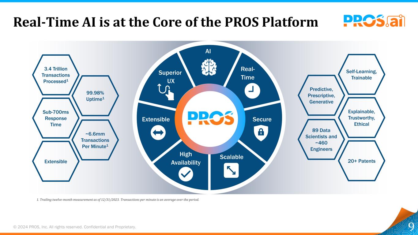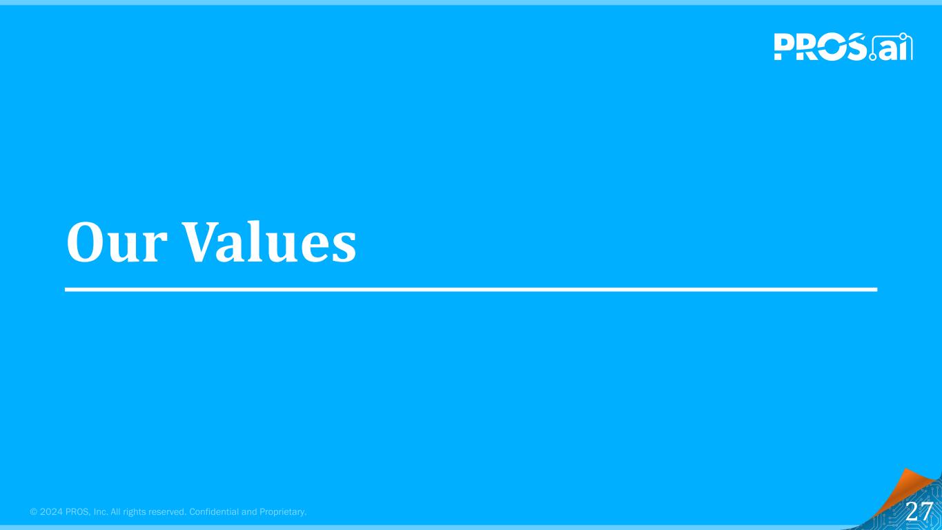 © 2024 PROS,Inc.版权所有。保密和专有。0% 5% 10% 15% 20% 2022A 2023A 2024E到20261年实现以“40规则”为目标的“40规则”进展2416-21 % 19-24 % 2026年总收入增长2026年自由现金流边际1。2026年的财政目标假定宏观经济条件与截至本报告提出时的条件保持一致。这些收入增长和自由现金流利润率目标是前瞻性陈述。鉴于与PROS业务和运营相关的风险、不确定性和假设,PROS未来的实际结果可能与这些目标存在重大差异。投资者应查看本演示文稿中提及并包含在公司SEC文件中的公司警示性声明和风险因素。2.预计的2024年总收入增长率和自由现金流利润率是基于这些指标各自的2024年指导范围的中点。2024年预期是前瞻性陈述。鉴于与PROS业务和运营相关的风险、不确定性和假设,PROS未来的实际结果可能与这些预期存在重大差异。投资者应查看本演示文稿中提及并包含在公司SEC文件中的公司警示性声明和风险因素。2