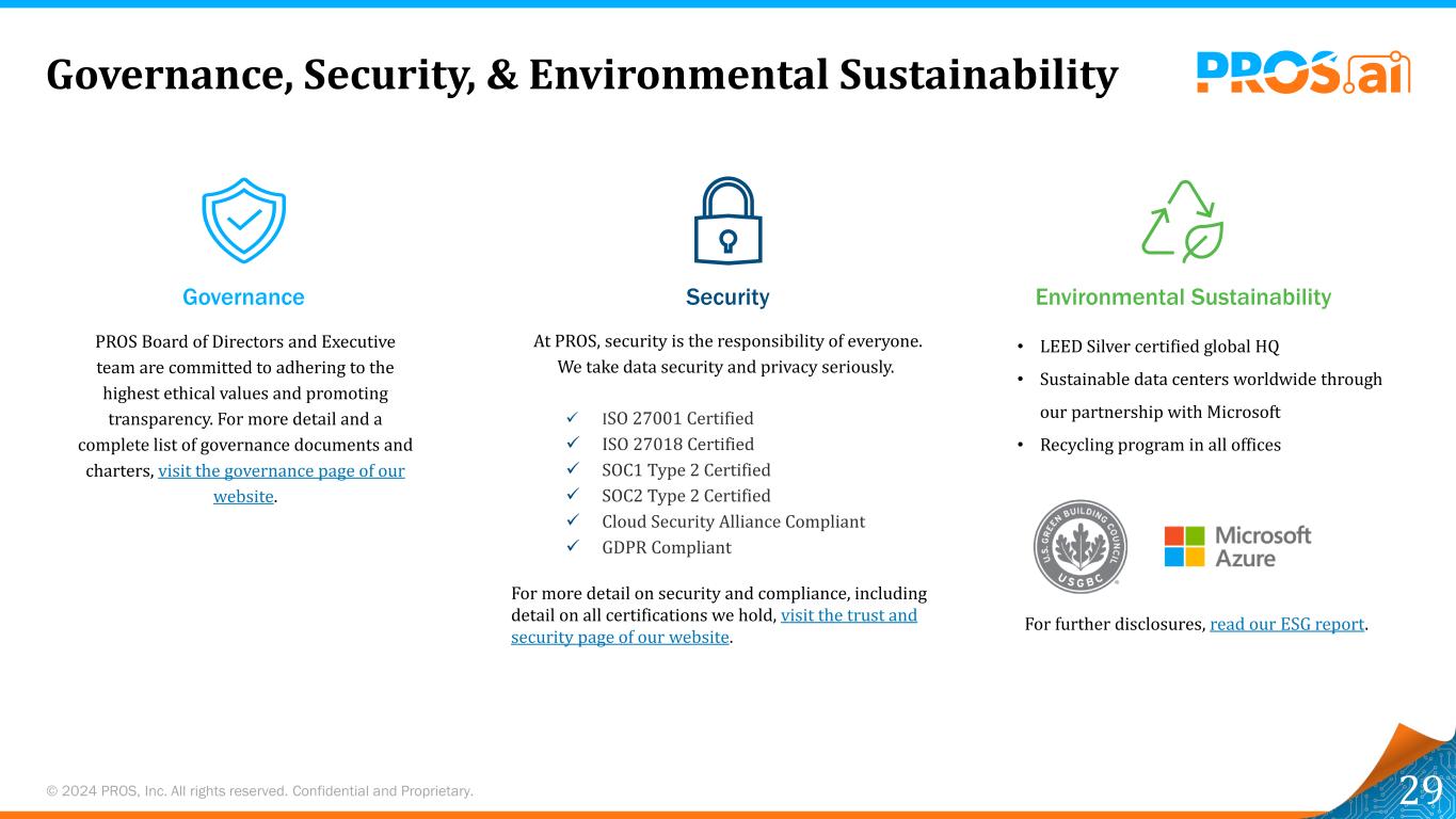 © 2024 PROS,Inc.版权所有。保密和专有。我们的使命:帮助个人和公司超越28我们是创新者,他们创造性地思考,为我们的员工、我们的客户和我们的业务找到通往成功的新道路。我们关心以人为本——我们的客户、员工、合作伙伴和社区——这是我们的公司是如何开始的,以及我们将如何始终经营它。寻找每一个机会为我们的客户创造更好的PROS和更好的体验,我们对自己负责。我们是所有者