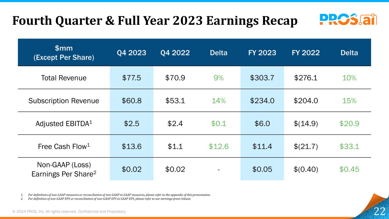 © 2024 PROS,Inc.版权所有。保密和专有。2023年第四季度和全年收益回顾22美元(每股除外)2023年第四季度2022年第四季度德尔塔2023财年2022财年德尔塔总收入77.5美元70.99% 303.7美元276.1 10%订阅收入60.8美元53.114% 234.0美元204.01 5%调整后EBITDA 1美元2.5美元2.4美元0.1美元6.0美元(14.9)20.9美元自由现金流1美元13.6美元1.1美元12.6美元11.4美元(21.7)33.1美元非公认会计原则(亏损)每股收益2美元0.02美元0.02美元-0.05美元(0.40)0.45美元1。有关非GAAP措施的定义或非GAAP与GAAP措施的对账,请参阅本演示文稿的附录。2.有关非GAAP EPS的定义或非GAAP EPS与GAAP EPS的对账,请参阅我们的收益新闻稿。