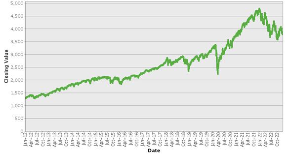 下图显示了标准普尔500指数的收盘价®从2012年1月3日至2022年12月30日,每天都有这种数值的索引。我们从Bloomberg L.P.获得了收盘价,但没有进行独立验证。您不应将历史收盘值作为未来表现的指示。