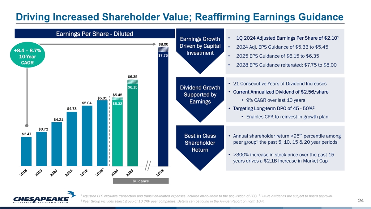 推动股东价值增加;重申盈利指引每股收益-稀释后1 • 2024年第一季度调整后每股收益为2.10美元盈利增长8.00美元受资本推动• 2024年调整后每股收益指引为5.33美元至5.45美元+ 8.4 – 8.7%投资7.75美元• 2025年每股收益指引为6.15美元至6.35美元10年复合年增长率• 2028年每股收益指引重申:7.75美元至8.00美元6.35美元•连续21年股息增加6.15美元股息增长•当前年化股息为2.56美元/股5.45美元,过去10年复合年增长率为5.31美元•9%,盈利5.04美元5.33 2美元4.73美元•目标长期DPO为45-50% •使CPK能够对增长计划进行再投资$ 4.21 $ 3.72 $ 3.47 th •年度股东回报率> 95个百分位,在过去5、10、15和20年期间在第3类同业组中名列前茅股东回报•>过去15年股价上涨300%推动市值指引增加$ 2.1B 12调整后每股收益不包括因收购FCG而产生的交易和过渡相关费用。未来股息须经董事会批准。324 Peer Group包括10家CKP同行公司的精选组。详情可见10-K表格的年度报告。
