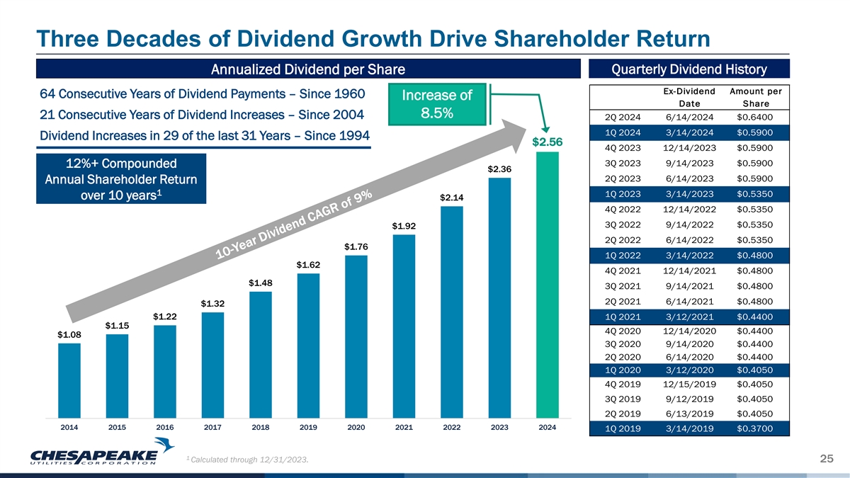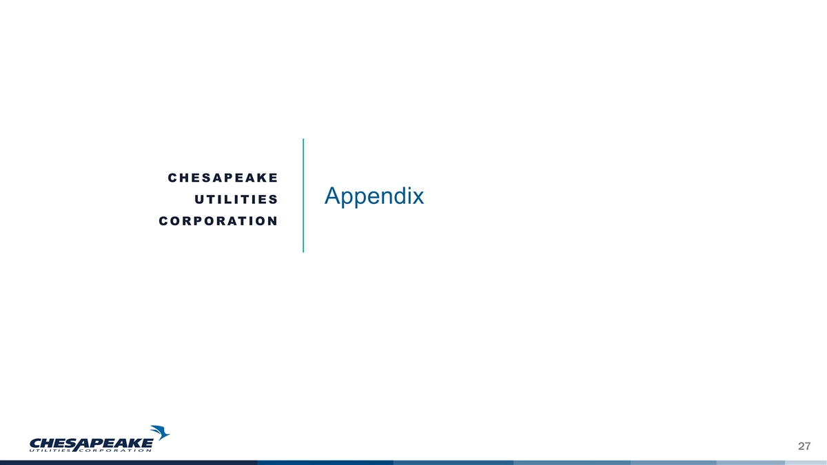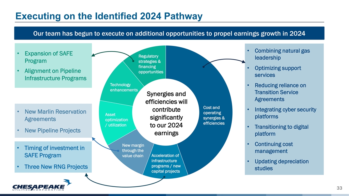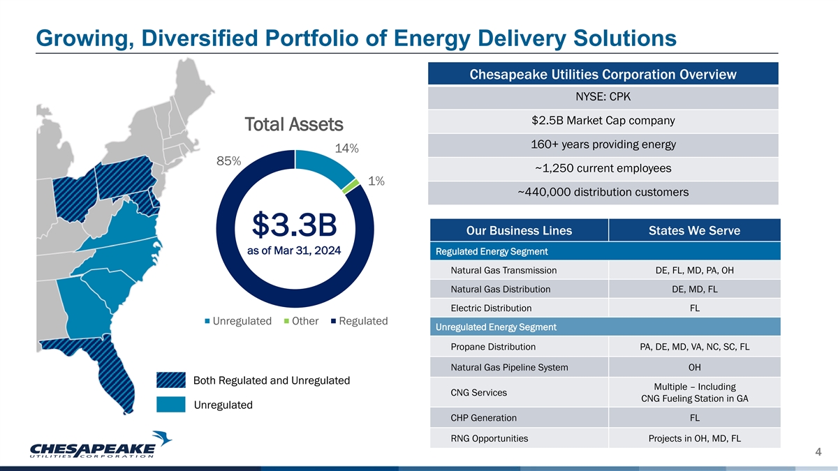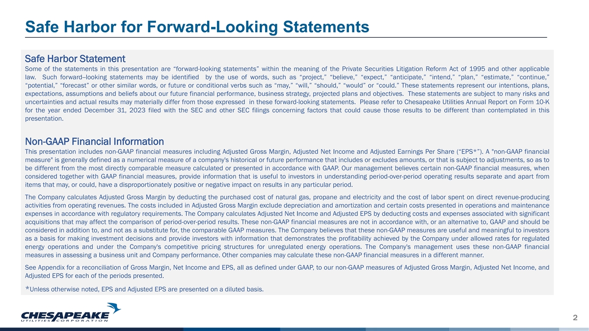 前瞻性陈述的安全港安全港声明本演示文稿中的一些陈述是1995年《私人证券诉讼改革法案》和其他适用法律含义内的“前瞻性陈述”。此类前瞻性陈述可以通过使用诸如“项目”、“相信”、“预期”、“预期”、“打算”、“计划”、“估计”、“继续”、“潜在”、“预测”或其他类似词语来识别,或使用诸如“可能”、“将”、“应该”、“将”或“可以”等未来或条件动词。这些陈述代表了我们对未来财务业绩、业务战略、预计计划和目标的意图、计划、期望、假设和信念。这些陈述受到许多风险和不确定性的影响,实际结果可能与这些前瞻性陈述中表达的结果存在重大差异。请参阅切萨皮克气业向SEC提交的截至2023年12月31日止年度的10-K表格年度报告以及其他SEC文件,这些文件涉及可能导致这些结果与本演示文稿中预期的不同的因素。非GAAP财务信息本演示文稿包括非GAAP财务指标,包括调整后的毛利率、调整后的净收入和调整后的每股收益(“EPS *”)。非公认会计原则财务计量通常被定义为公司历史或未来业绩的数字计量,其中包括或不包括金额,或可能进行调整,从而有别于根据公认会计原则计算或呈报的最直接可比计量。我们的管理层认为,当与GAAP财务指标一起考虑时,某些非GAAP财务指标提供的信息有助于投资者理解与可能或可能对任何特定时期的业绩产生不成比例的正面或负面影响的项目分开和分开的期间经营业绩。公司通过从营业收入中扣除采购的天然气、丙烷和电力成本以及用于直接创收活动的劳动力成本来计算调整后的毛利率。调整后毛利率中包含的成本不包括折旧和摊销以及根据监管要求在运营和维护费用中列报的某些成本。公司通过扣除与可能影响同期业绩比较的重大收购相关的成本和费用来计算调整后的净收入和调整后的每股收益。这些非GAAP财务指标不符合或替代GAAP,应作为可比GAAP指标的补充考虑,而不是替代。公司认为,这些非公认会计原则措施对投资者有用且有意义,可作为作出投资决策的基础,并为投资者提供信息,证明公司在受监管能源运营的允许费率和公司在不受监管能源运营的竞争性定价结构下实现的盈利能力。该公司管理层在评估一个业务部门和公司业绩时使用了这些非公认会计准则财务指标。其他公司可能会以不同的方式计算这些非GAAP财务指标。请参阅附录,了解毛利率、净收入和每股收益的对账情况,所有这些都是在GAAP下定义的,与我们的非GAAP调整后毛利率、调整后净收入和调整后每股收益的衡量标准在每个报告期间的对账情况。*除非另有说明,每股收益和调整后每股收益均按稀释后的基础列报。2