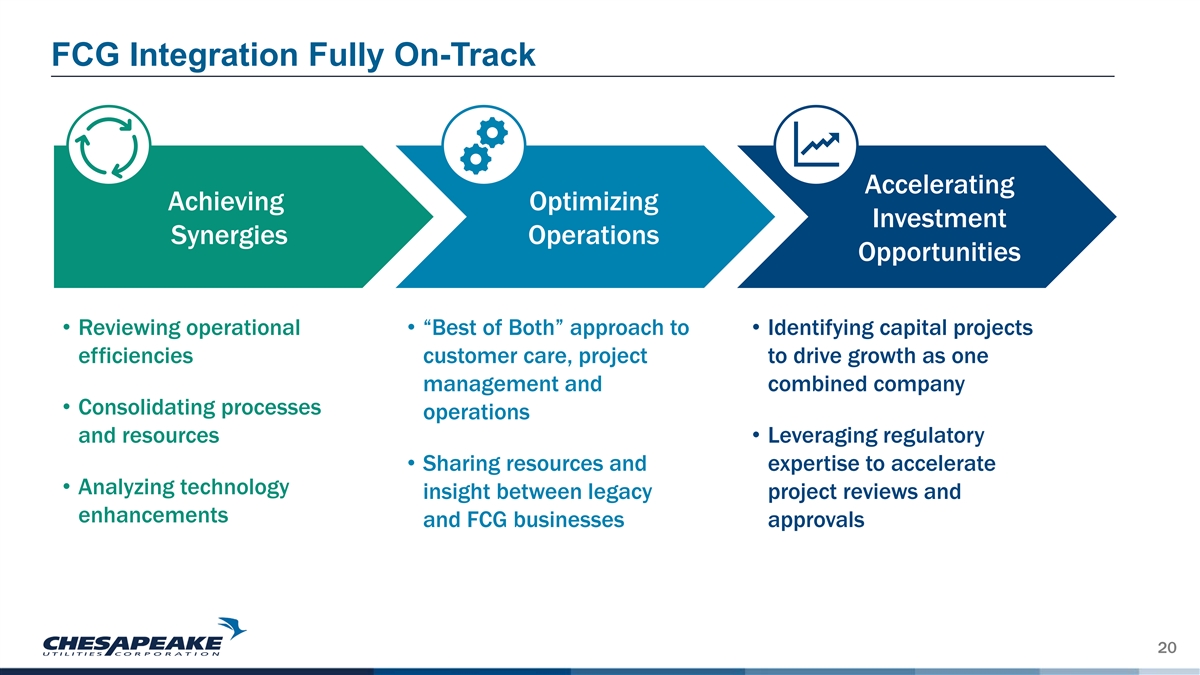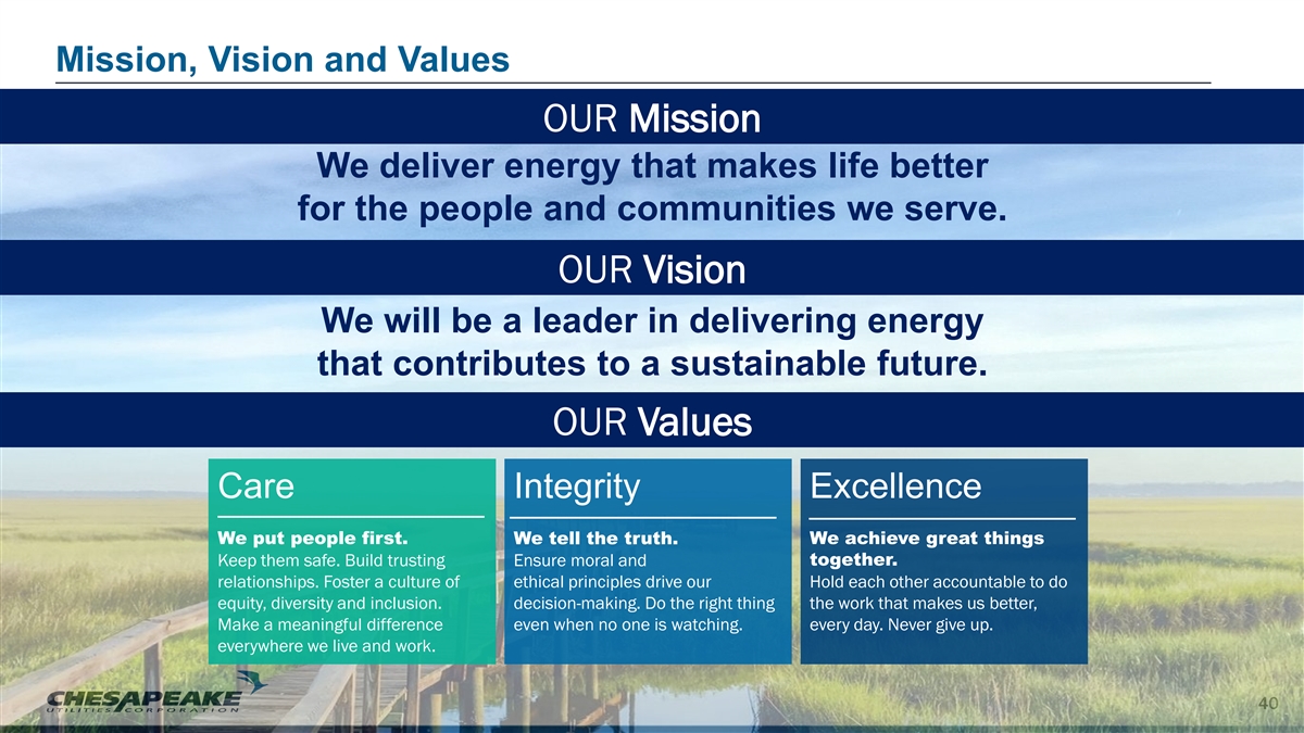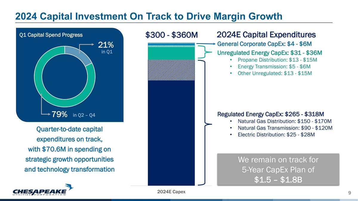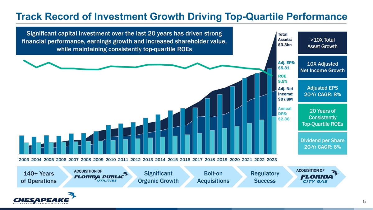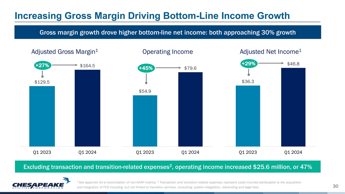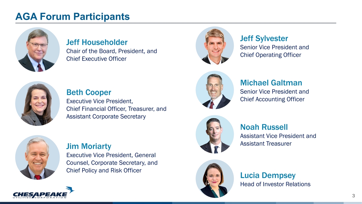 前瞻性陈述的安全港安全港声明本演示文稿中的一些陈述是1995年《私人证券诉讼改革法案》和其他适用法律含义内的“前瞻性陈述”。此类前瞻性陈述可以通过使用诸如“项目”、“相信”、“预期”、“预期”、“打算”、“计划”、“估计”、“继续”、“潜在”、“预测”或其他类似词语来识别,或使用诸如“可能”、“将”、“应该”、“将”或“可以”等未来或条件动词。这些陈述代表了我们对未来财务业绩、业务战略、预计计划和目标的意图、计划、期望、假设和信念。这些陈述受到许多风险和不确定性的影响,实际结果可能与这些前瞻性陈述中表达的结果存在重大差异。请参阅切萨皮克气业向SEC提交的截至2023年12月31日止年度的10-K表格年度报告以及其他SEC文件,这些文件涉及可能导致这些结果与本演示文稿中预期的不同的因素。非GAAP财务信息本演示文稿包括非GAAP财务指标,包括调整后的毛利率、调整后的净收入和调整后的每股收益(“EPS *”)。非公认会计原则财务计量通常被定义为公司历史或未来业绩的数字计量,其中包括或不包括金额,或可能进行调整,从而有别于根据公认会计原则计算或呈报的最直接可比计量。我们的管理层认为,当与GAAP财务指标一起考虑时,某些非GAAP财务指标提供的信息有助于投资者理解与可能或可能对任何特定时期的业绩产生不成比例的正面或负面影响的项目分开和分开的期间经营业绩。公司通过从营业收入中扣除采购的天然气、丙烷和电力成本以及用于直接创收活动的劳动力成本来计算调整后的毛利率。调整后毛利率中包含的成本不包括折旧和摊销以及根据监管要求在运营和维护费用中列报的某些成本。公司通过扣除与可能影响同期业绩比较的重大收购相关的成本和费用来计算调整后的净收入和调整后的每股收益。这些非GAAP财务指标不符合或替代GAAP,应作为可比GAAP指标的补充考虑,而不是替代。公司认为,这些非公认会计原则措施对投资者有用且有意义,可作为作出投资决策的基础,并为投资者提供信息,证明公司在受监管能源运营的允许费率和公司在不受监管能源运营的竞争性定价结构下实现的盈利能力。该公司管理层在评估一个业务部门和公司业绩时使用了这些非公认会计准则财务指标。其他公司可能会以不同的方式计算这些非GAAP财务指标。请参阅附录,了解毛利率、净收入和每股收益的对账情况,所有这些都是在GAAP下定义的,与我们的非GAAP调整后毛利率、调整后净收入和调整后每股收益的衡量标准在每个报告期间的对账情况。*除非另有说明,每股收益和调整后每股收益均按稀释后的基础列报。2