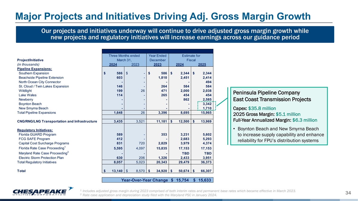 推动Adj.毛利率增长的主要项目和举措我们正在进行的项目和举措将继续推动调整后的毛利率增长,而新项目和监管举措将在我们的指导期内增加收益截至3月31日的三个月项目/举措的年终估计,12月财政(千)20242023202320242025管道扩建:南部扩建$ 586 $-$ 586 $ 2,344 $ 2,344 Beachside Pipeline Extension 603-1,8102,4512,414 North Ocean City Connector----494 St. Cloud/Twin Lakes Extension 146-264584584 Wildlight 199264712,0002,038 Peninsula Pipeline Company Lake Wales 114-265454454 Newberry---8622,585 East Coast Transmission Projects Boynton Beach----3,342 New Smyrna Beach----1,710 Capex:3580万美元管道扩建总额1,648263,3968,69515,9652025毛利率:510万美元全年年化利润率:630万美元CNG/RNG/LNG运输和基础设施3,4353,52111,181美元12,500美元13,969美元• Boynton Beach和New Smyrna Beach监管举措:Florida GUARD Program 589-3533,2315,602以提高供应能力并增强FCG安全计划412--2,6835,293可靠性FPU的配电系统资本成本附加费计划8317202,8293,9794,3741佛罗里达费率案件处理5,5954,09715,83517,15317,1532马里兰费率案件处理---待定待定待定待定待定电气风暴保护计划6302061,3262,4333,951总监管举措8,0575,02320,34329,47936,373总计13,140美元8,570美元34,920美元50,674美元66,307美元同比变化15,754美元15,6331包括2023年调整后的毛利率,包括两个中期费率以及2023年3月生效的永久基本利率。342 Rate案例申请和折旧研究于2024年1月向马里兰州PSC提交。