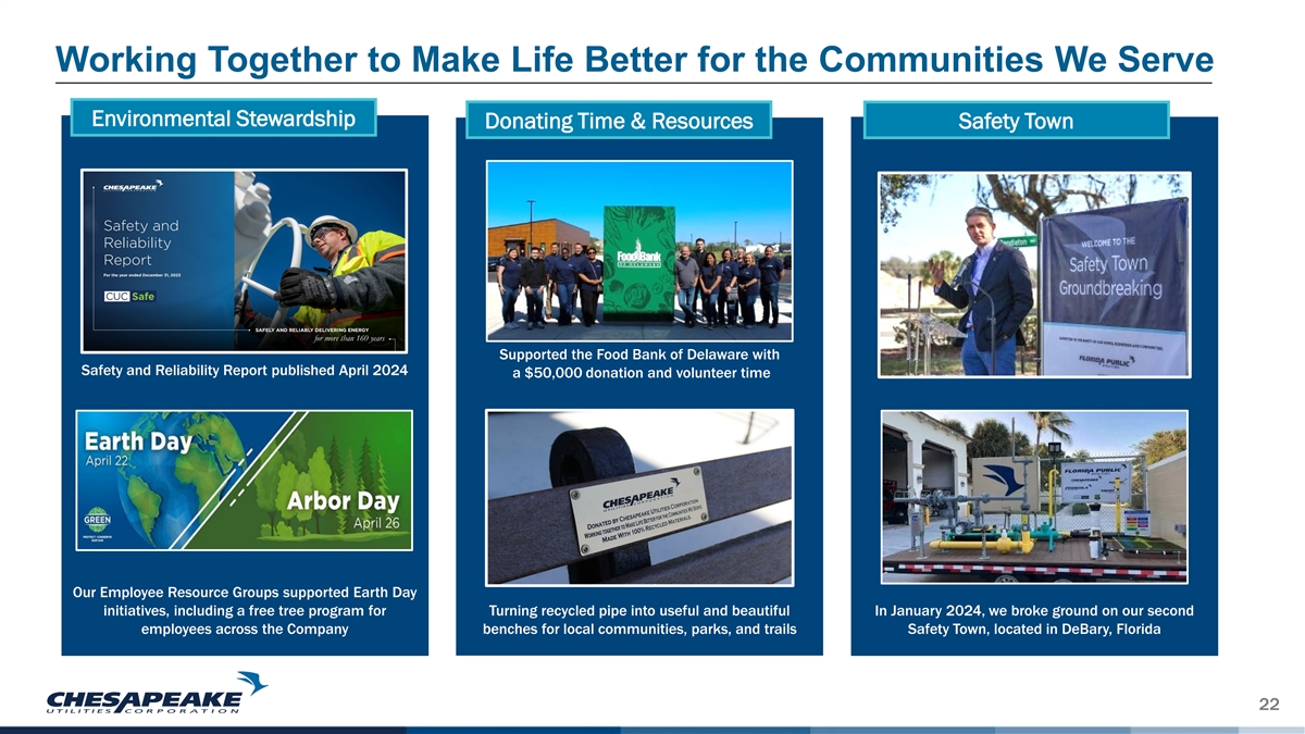 共同努力,让我们所服务的社区生活更美好环境管理捐赠时间和资源安全小镇以安全和可靠性支持特拉华州食品银行2024年4月发布的报告5万美元的捐赠和志愿者时间我们的员工资源小组支持地球日倡议,包括2024年1月将回收管道变成有用和美丽的免费树木计划,我们在位于佛罗里达州德巴里的当地社区、公园和小径安全小镇的公司长椅上破土动工22