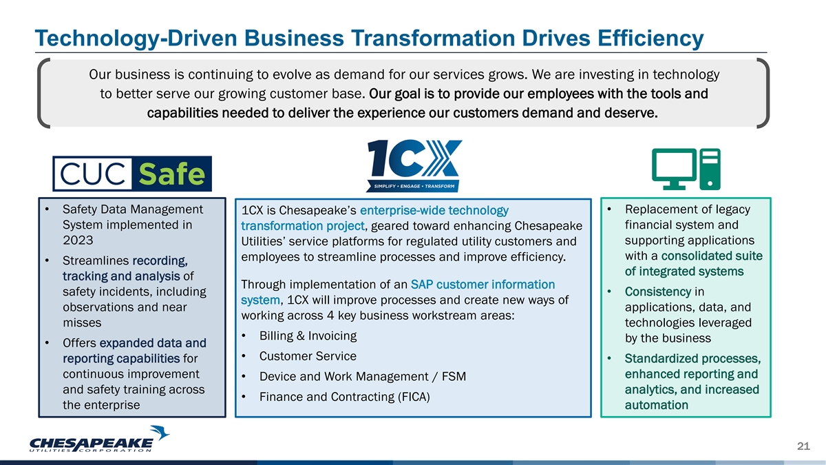 技术驱动的业务转型推动效率随着对我们服务需求的增长,我们的业务正在持续发展。我们正在投资技术,以更好地服务于我们不断增长的客户群。我们的目标是为我们的员工提供所需的工具和能力,以提供客户需要和应得的体验。•安全数据管理•替换遗留的1CX是切萨皮克在财务系统和改造项目中实施的企业范围技术系统,面向增强切萨皮克2023支持应用程序公用事业公司为受监管的公用事业客户提供的服务平台,并配有一个整合的套件员工,以简化流程并提高效率。•简化记录,综合系统跟踪和分析通过实施SAP客户信息安全事件,包括•系统的一致性,1CX将改进流程并创建新的观察方式以及在4个关键业务工作流领域的近应用程序、数据和工作方式:利用miss技术•由企业计费和开具发票•提供扩展的数据和•客户服务报告能力,用于•标准化流程、持续改进增强报告和•设备和工作管理/FSM以及跨分析的安全培训,并增加•财务和承包(FICA)企业自动化21