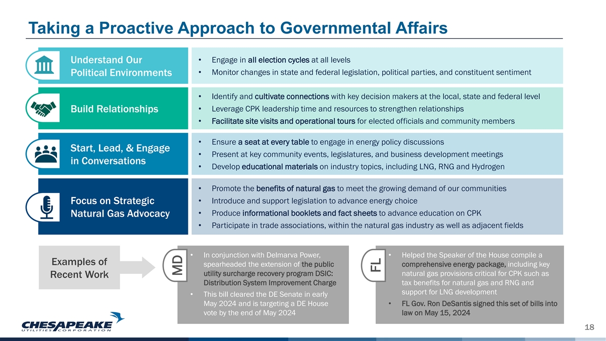 费率案件的建设性监管环境在考虑中完成正在进行中佛罗里达州公立佛罗里达州马里兰州最不发达国家:切萨皮克气业、特拉华州最不发达国家公用事业公司城市燃气Sandpiper Energy和Elkton Gas Company •向特拉华州提交了“意向•费率案件于2024年1月30日提交•费率变为•费率变为备案”,自2024年5月1日起生效PSC •提议于2023年5月1日3月1日加息690万美元,向CPK提供•寻求合并我们的三个MD天然气2023将1,410万美元的分销实体归入一个法人实体的机会:“Chesapeake full rate case on or • $ 1,720万rate increase;Utilities of Maryland,Inc.”在2024年7月1日之后的费率上调;允许ROE为•提出某些其他关税变化,包括:允许ROE为8.5%-10.5 %•建立新的技术成本回收骑手,为10.25% •储备和权益•将某些投资滚动为基准费率,其他盈余百分比•为预期的能源摊销建立监管资产•继续监测55%效率的备案,并将备案的需要机制在•合并授权•建立服务不足地区(美国)费率和两个司法管辖区的计划,用于评估多户项目的扩展,四个自然FCG在其天然气内赚取没有近期费率•参加了5月16日的和解会议,以处理以下案件:Eastern Shore批准的ROE分配在折旧研究中建立和解,& Florida Electric range实体代表每年潜在节省110万美元17