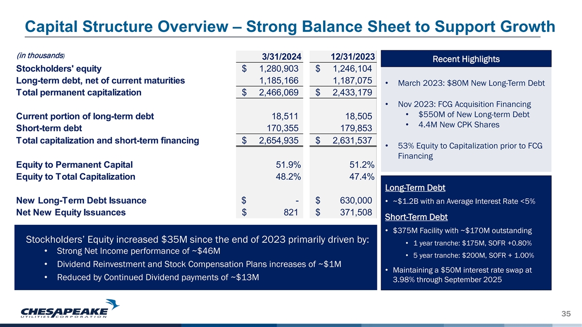 资本Structure概览–强劲的资产负债表以支持增长(单位:千)3/31/202412/31/2023近期亮点股东权益1,280,903美元1,246,104美元长期债务,扣除当前到期日1,185,1661,187,075 • 2023年3月:8000万美元新的长期债务总额永久资本化2,466,069美元2,433,179美元• 2023年11月:FCG收购融资• 5.5亿美元新的长期债务长期债务的流动部分18,51118,505 • 440万新的丨CPK股短期债务170,355179,853总资本和短期融资2,654,935美元2,631,537美元• 53%股权占FCG融资前资本化股权占永久资本51.9% 51.2%股权占总资本48.2% 47.4%长期债务新长期债务发行$-$ 630,000 •~$ 1.2B,平均利率< 5%净新股发行$ 821 $ 371,508短期债务• 3.75亿美元的融资和约1.70亿美元的已发行股东权益自2023年底以来增加了3500万美元,主要是由于:• 1年期:1.75亿美元,SOFR + 0.80% •强劲的净收入表现约为4600万美元• 5年期:2亿美元,SOFR + 1.00% •股息再投资和股票补偿计划增加约100万美元•将5000万美元的利率互换维持在•由于到2025年9月持续支付约1300万美元的股息而减少3.98% 35