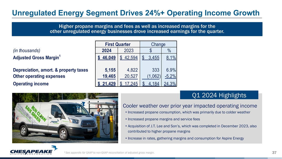 不受监管的能源部门推动24% +营业收入增长更高的丙烷利润率和费用以及其他不受监管的能源业务的利润率增加推动了本季度的收益增长。第一季度变化(千)20242023$% 1调整后毛利率46美元049美元42美元594美元3,4558.1%折旧,金额。&物业税5,1554,8223336.9%其他营业费用19,46520,527(1,062)-5.2 %营业收入$ 21,429 $ 17,245 $ 4,18424.3% 2024年第一季度突出显示较上年凉爽的天气影响了营业收入•丙烷消费量增加,这主要是由于天气变冷•丙烷利润率和服务费增加•于2023年12月完成的对J.T. Lee and Son’s的收购也有助于提高丙烷利润率•费率增加,为Aspire Energy 1聚集了利润率和消费量,调整后毛利率的GAAP与非GAAP对账见附录。37