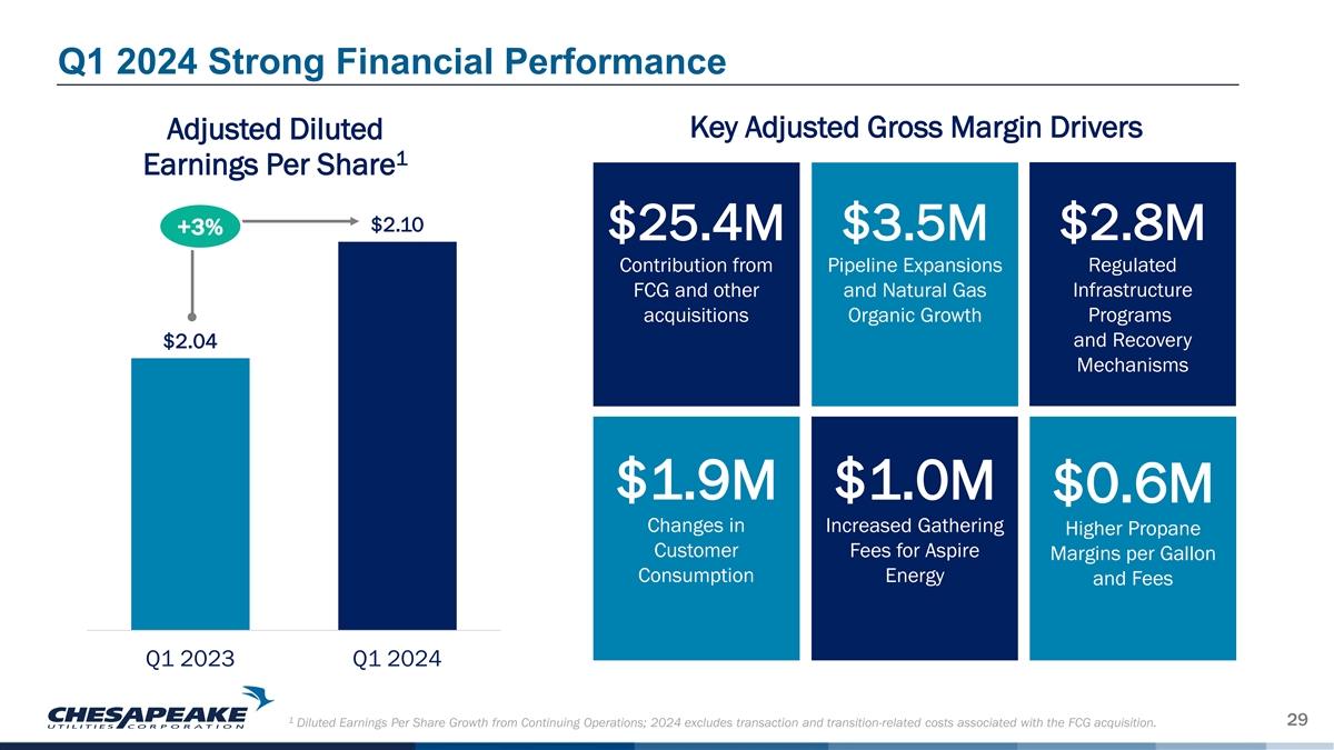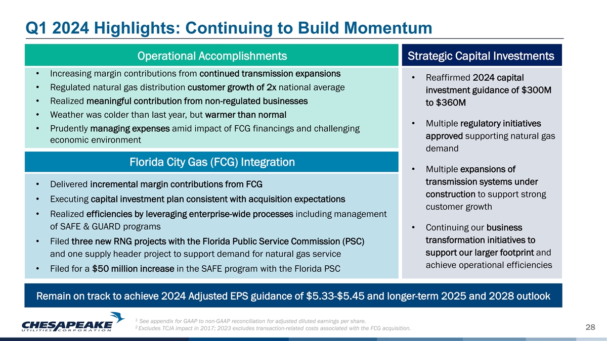 2024年第一季度亮点:继续建立势头运营成就战略资本投资•不断扩大输电规模带来的利润贡献增加•重申2024年资本•受监管的天然气分销客户增长2倍全国平均投资指引为3亿美元•非受监管业务实现了有意义的贡献,达到3.6亿美元•天气比去年更冷,但比正常情况要暖•多项监管举措•在FCG融资和对已批准的配套天然气经济环境需求提出挑战的影响下,审慎管理费用佛罗里达州城市燃气(FCG)集成•传输系统的多项扩展•提供了来自FCG建设的增量利润贡献,以支持强劲•执行与收购预期客户增长一致的资本投资计划•通过利用包括管理SAFE和GUARD计划在内的企业范围流程实现效率•继续我们的业务转型举措,以•向佛罗里达州公共服务委员会(PSC)提交三个新的RNG项目,以支持我们更大的足迹以及一个支持天然气服务需求的供应总管项目实现了运营效率•向佛罗里达州PSC申请增加5000万美元的SAFE计划仍在按计划实现2024年调整后每股收益指引5.33-5.45美元和更长期的2025年和2028年展望1调整后稀释每股收益的GAAP与非GAAP对账见附录。228不包括2017年的TCJA影响;2023年不包括与收购FCG相关的交易相关成本。